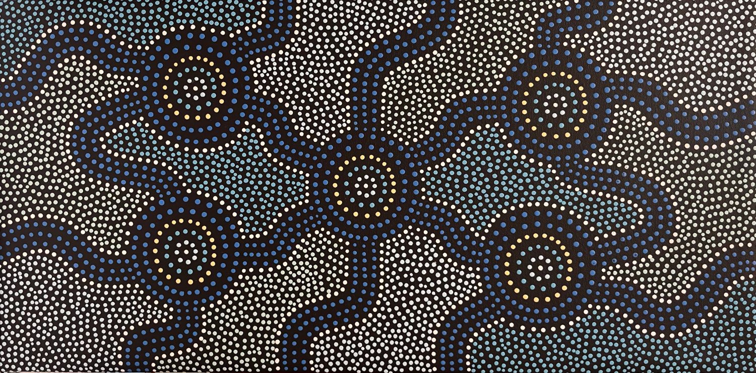 "This painting shows our country, the coastal and inland Aboriginal communities. The circles represent family groups and clans with tracks that show their connection to other Aboriginal groups within the nation." Bundjalung Sean.