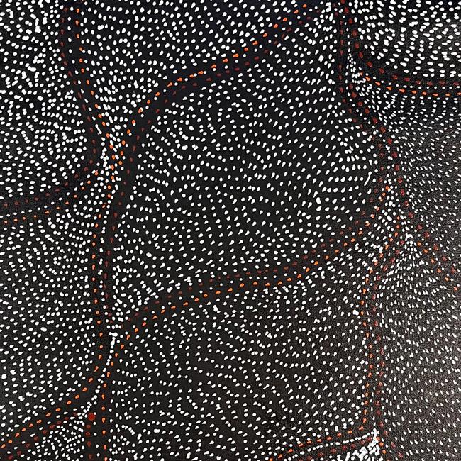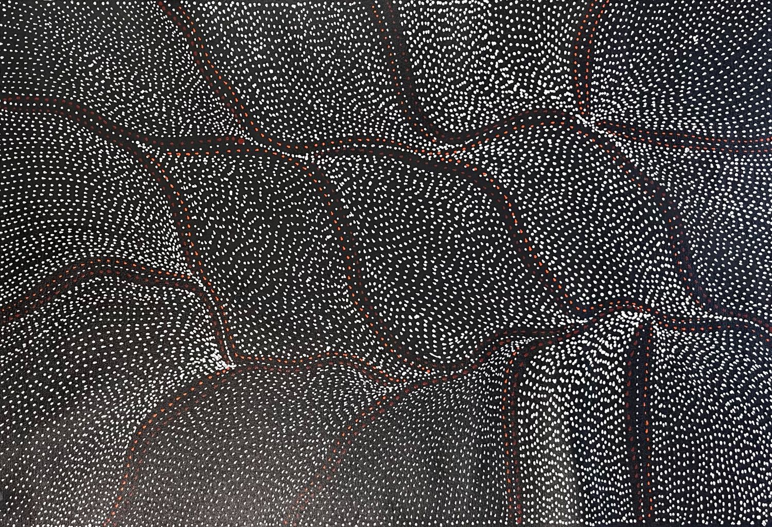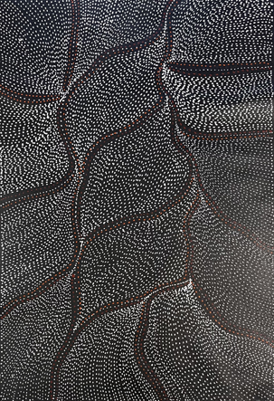 This painting depicts the geological formations and the striations etched into the landscape. Price paints from a topographic perspective and only using fine white dots she captures the beauty of movement in the land.