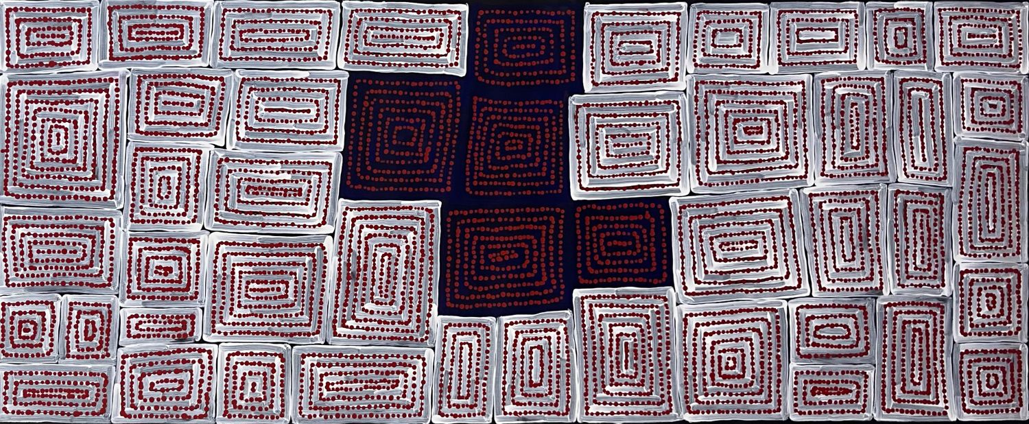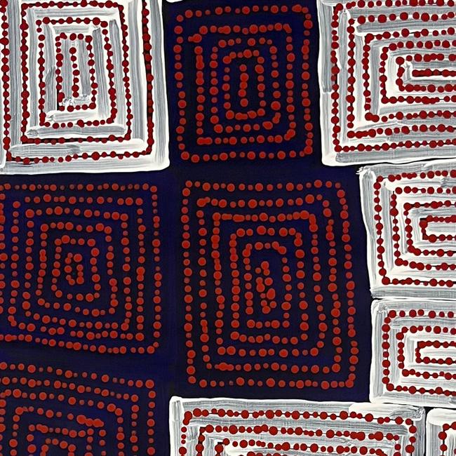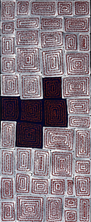 This work depicts elements of the Tingari creation event. This Dreaming story concerns the paths the Tingari ancestors took as they moved through country in the Western Desert area, shaping and creating sacred sites.