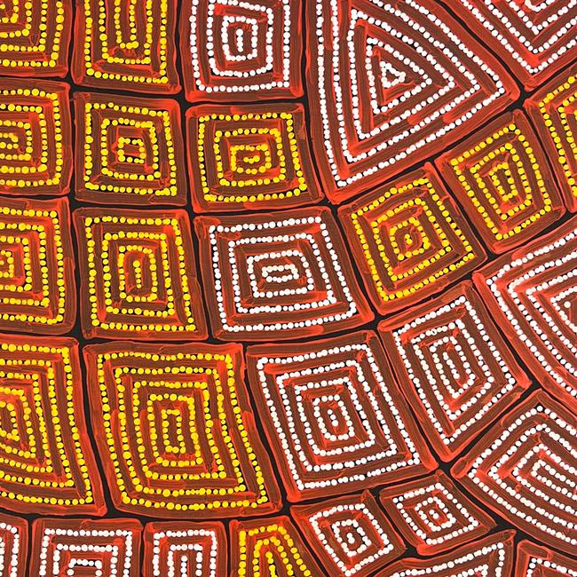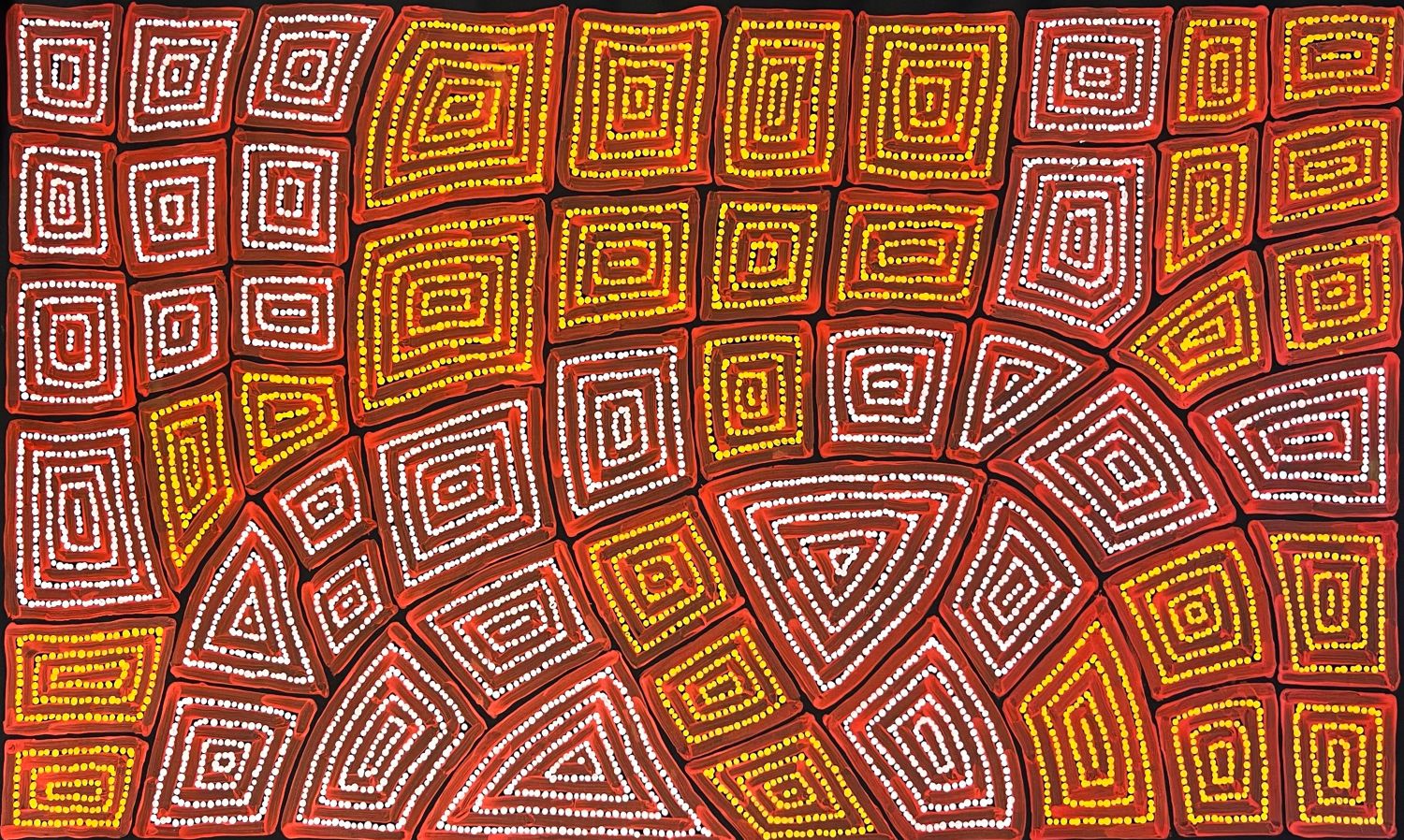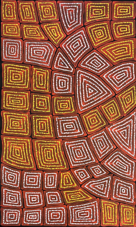 This work depicts elements of the Tingari creation event. This Dreaming story concerns the paths the Tingari ancestors took as they moved through country in the Western Desert area, shaping and creating sacred sites.