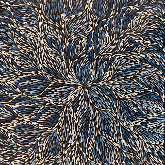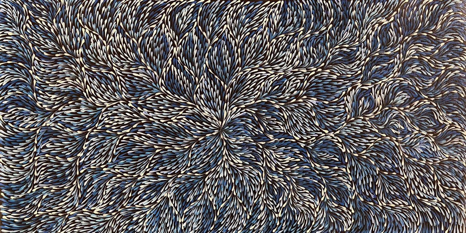 This work represents the leaves of the Kurrajong tree used in the Utopia region to treat a variety of ailments. The women collect the leaves, dry and mix them with Kangaroo fat, in order to extract the plant's medicinal qualities. The significance of the Kurrajong tree and the part it plays in healing is celebrated in the Women's Awelye ceremonies.