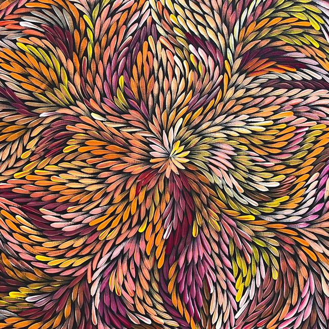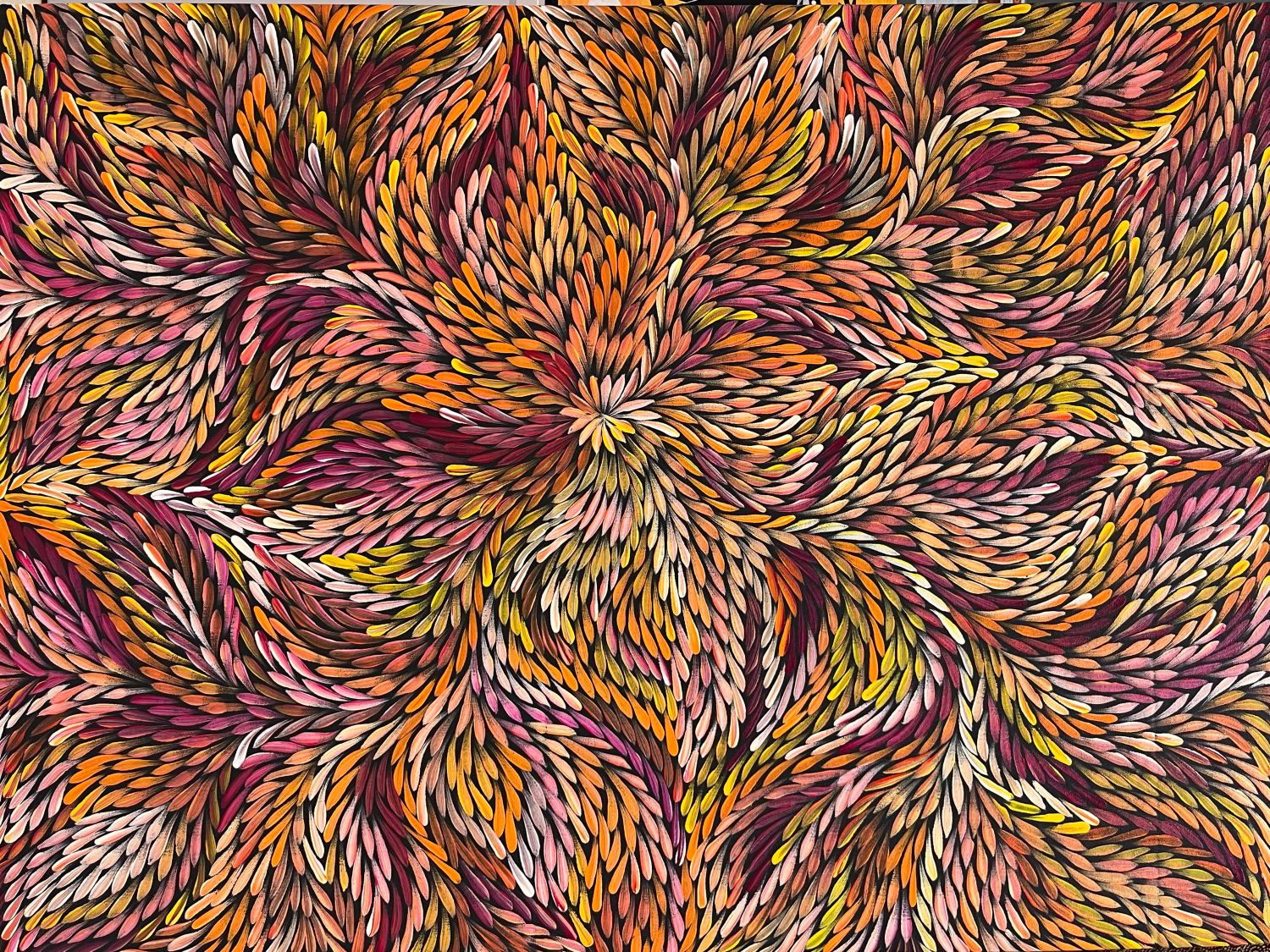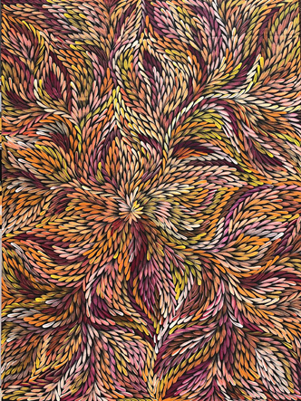 This work represents the leaves of the Kurrajong tree used in the Utopia region to treat a variety of ailments. The women collect the leaves, dry and mix them with Kangaroo fat, in order to extract the plant's medicinal qualities. The significance of the Kurrajong tree and the part it plays in healing is celebrated in the Women's Awelye ceremonies.