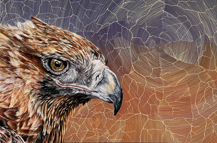 Tegan Hamilton developed her love for natural history, spending her formative years in rural Victoria. Using her passion to depict the wildlife around her she paints these majestic creatures which have such important connections to the King Sisters. Sarrita's collaboration is her Ngurra (HOME) Series with the magnificent Warlawurru (wedge tailed eagle), whose home is the sky. A place of energy and movement.