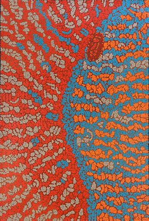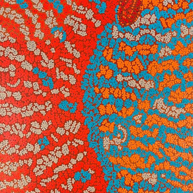 This painting represents the desert rains that fall and make the waterholes fill the waterholes. Some waterholes stay dry and some fill up with water. The water makes trails all along the desert as well depicted by the lines throughout the artwork.