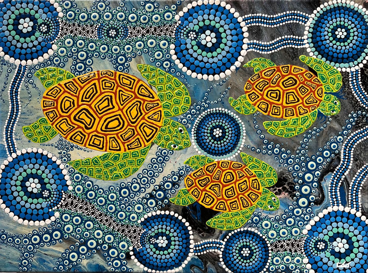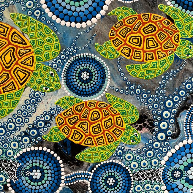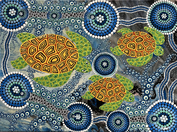 "The name for the sea turtle in one of our many languages is Miitinta. The painting shows the female turtles swimming to the sandy beach to lay their eggs. They always return to the same place each breeding season. Our people know the season so as to collect their eggs".
