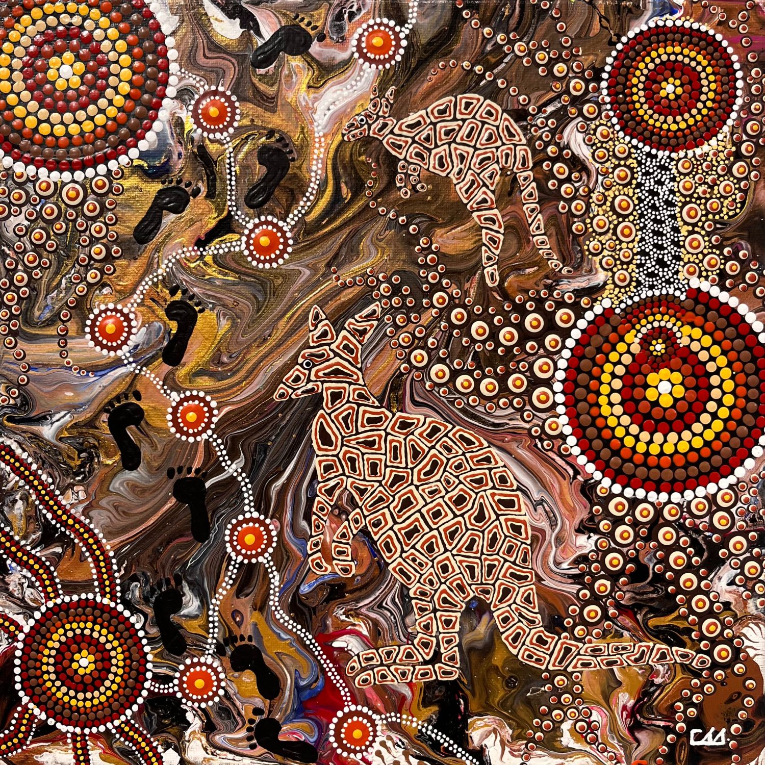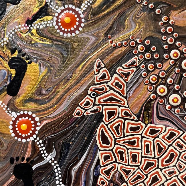 'The kangaroos blend in with the environment to keep safe. The circles are the life force of the earth.' Colin J Jones.
