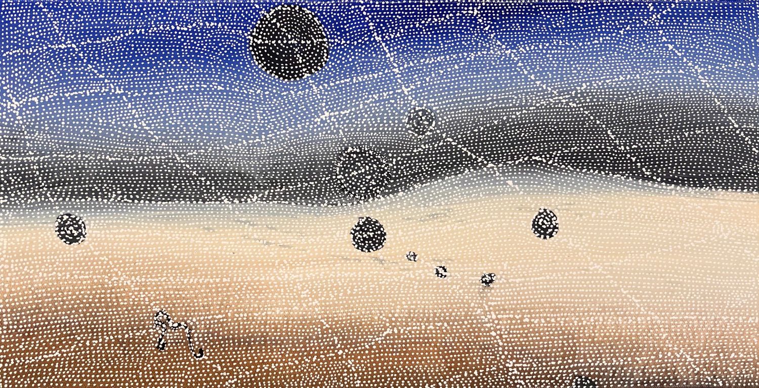 ‘Earth Elements’ is Sarrita’s latest series of artworks. Sarrita has been working on these ideas for years through her other series of works such as lightning and the elements artworks such as water. However Sarrita always wanted to make even more subtle artworks combining the many aspects of the earth elements and the repetitive patterns of these elements. In this particular piece Sarrita reflects on the beautiful fresh water pools that occur after the first big rainfalls or vast ocean waters. The colours are always different from one pool of water to another. But i am always amazed at the other markings that occur from the life on, in and around the water catchments. The fine dotting is an abstract representation of all this life. The subtleness and lightness of these dots represents the idea that these markings are made in the past, present and future, repetitive patterns for eternity.