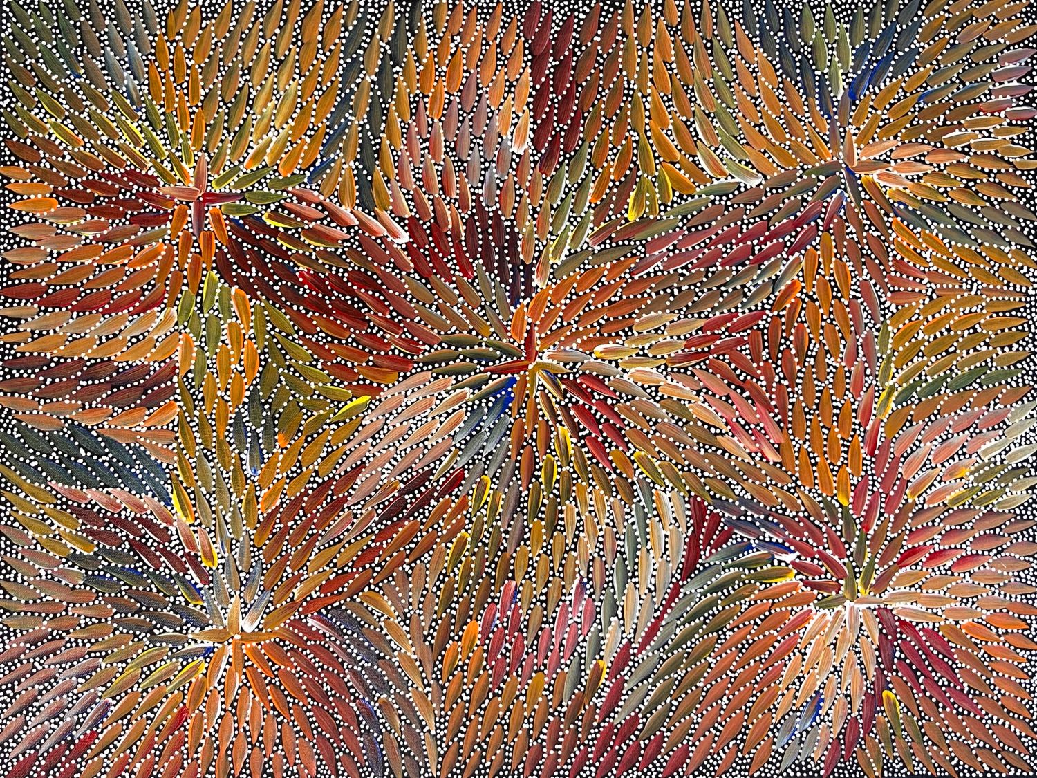 This work represents the leaves of the Kurrajong tree used in the Utopia region to treat a variety of ailments. The women collect the leaves, dry and mix them with Kangaroo fat, in order to extract the plant's medicinal qualities. The significance of the Kurrajong tree and the part it plays in healing is celebrated in the Women's Awelye ceremonies.