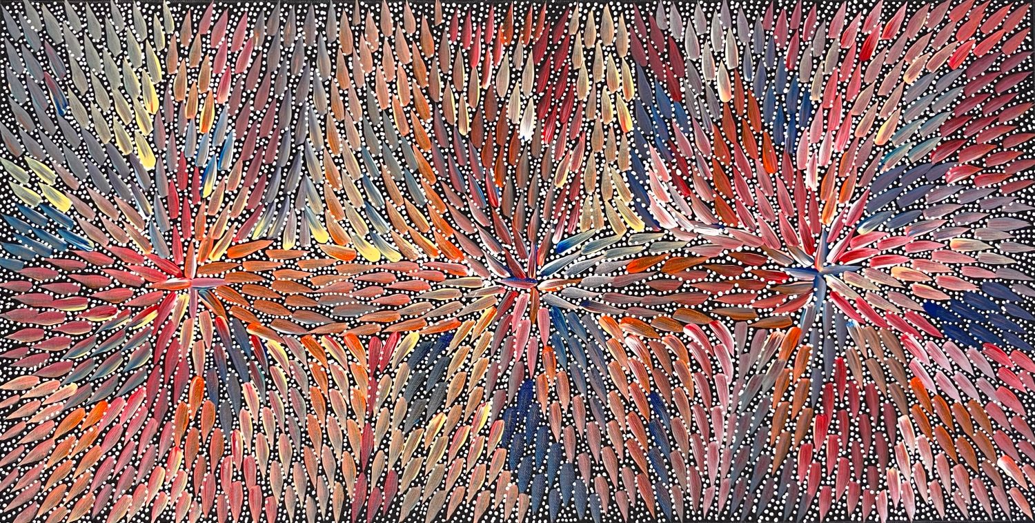 This work represents the leaves of the Kurrajong tree used in the Utopia region to treat a variety of ailments. The women collect the leaves, dry and mix them with Kangaroo fat, in order to extract the plant's medicinal qualities. The significance of the Kurrajong tree and the part it plays in healing is celebrated in the Women's Awelye ceremonies.