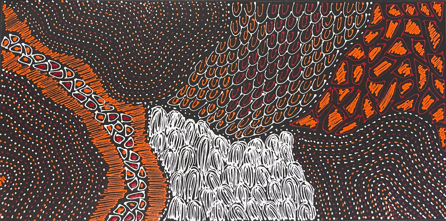 This painting depicts the geological formations and the striations etched into the landscape. Price paints from a topographic perspective and only using fine white dots she captures the beauty of movement in the land.
