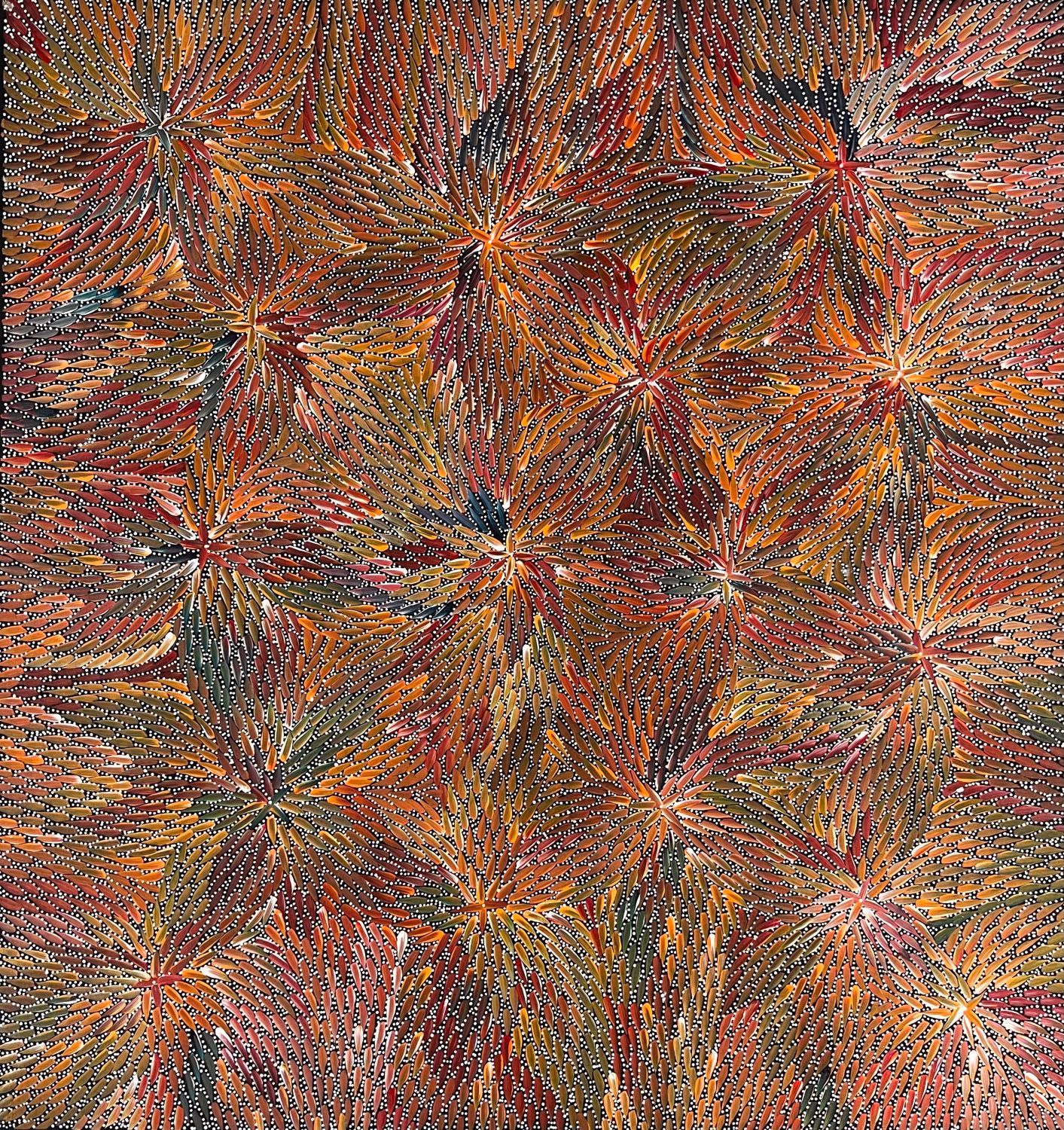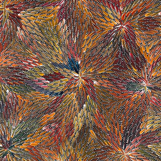 This work represents the leaves of the Kurrajong tree used in the Utopia region to treat a variety of ailments. The women collect the leaves, dry and mix them with Kangaroo fat, in order to extract the plant's medicinal qualities. The significance of the Kurrajong tree and the part it plays in healing is celebrated in the Women's Awelye ceremonies.