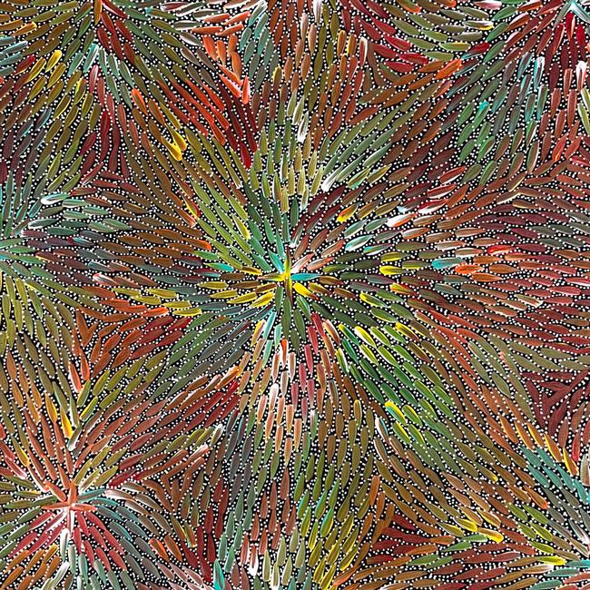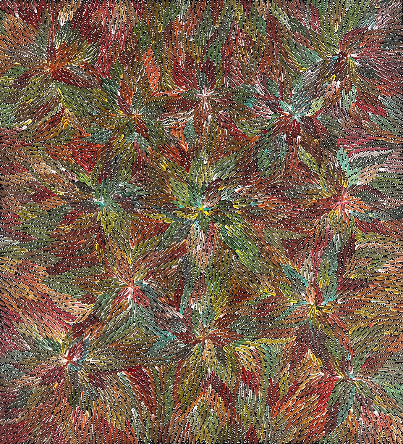 This work represents the leaves of the Kurrajong tree used in the Utopia region to treat a variety of ailments. The women collect the leaves, dry and mix them with Kangaroo fat, in order to extract the plant's medicinal qualities. The significance of the Kurrajong tree and the part it plays in healing is celebrated in the Women's Awelye ceremonies.
