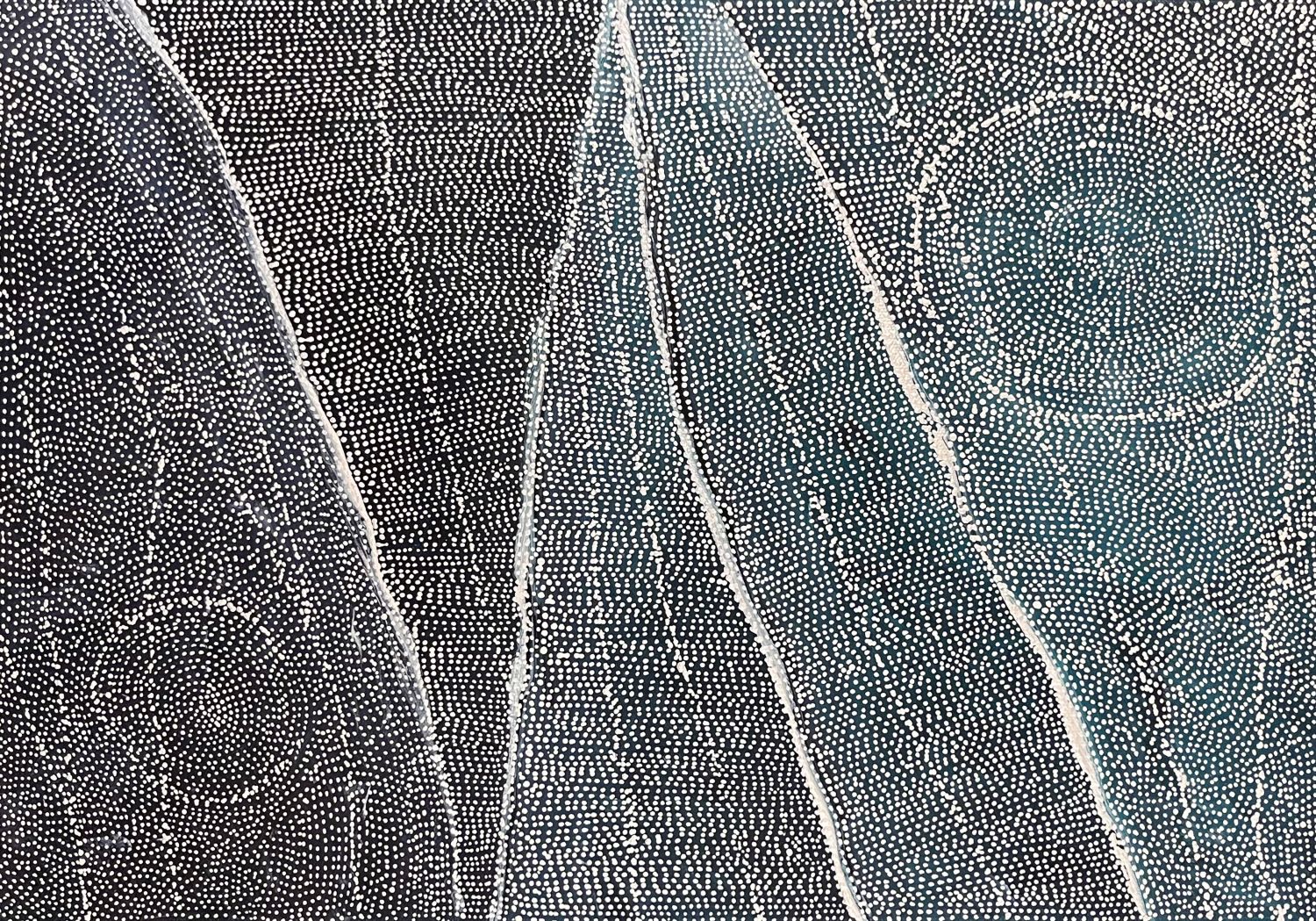 ‘Earth Elements’ is Sarrita’s latest series of artworks. Sarrita has been working on these ideas for years through her other series of works such as lightning and the elements artworks such as water. However Sarrita always wanted to make even more subtle artworks combining the many aspects of the earth elements and the repetitive patterns of these elements. In this particular piece Sarrita reflects on the beautiful fresh water pools that occur after the first big rainfalls or vast ocean waters. The colours are always different from one pool of water to another. But i am always amazed at the other markings that occur from the life on, in and around the water catchments. The fine dotting is an abstract representation of all this life. The subtleness and lightness of these dots represents the idea that these markings are made in the past, present and future, repetitive patterns for eternity.