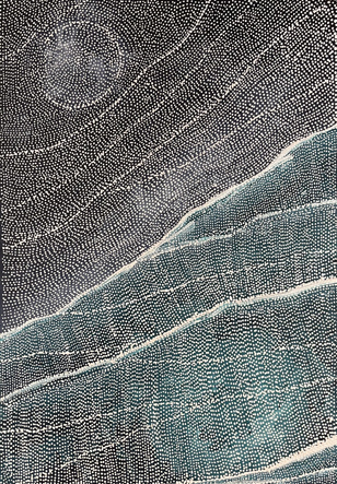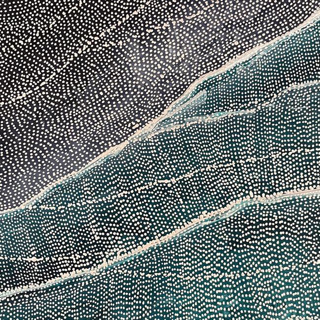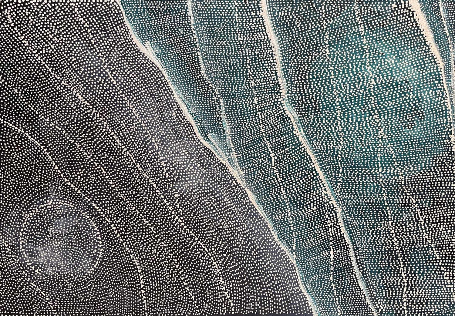 ‘Earth Elements’ is Sarrita’s latest series of artworks. Sarrita has been working on these ideas for years through her other series of works such as lightning and the elements artworks such as water. However Sarrita always wanted to make even more subtle artworks combining the many aspects of the earth elements and the repetitive patterns of these elements. In this particular piece Sarrita reflects on the beautiful fresh water pools that occur after the first big rainfalls or vast ocean waters. The colours are always different from one pool of water to another. But i am always amazed at the other markings that occur from the life on, in and around the water catchments. The fine dotting is an abstract representation of all this life. The subtleness and lightness of these dots represents the idea that these markings are made in the past, present and future, repetitive patterns for eternity.