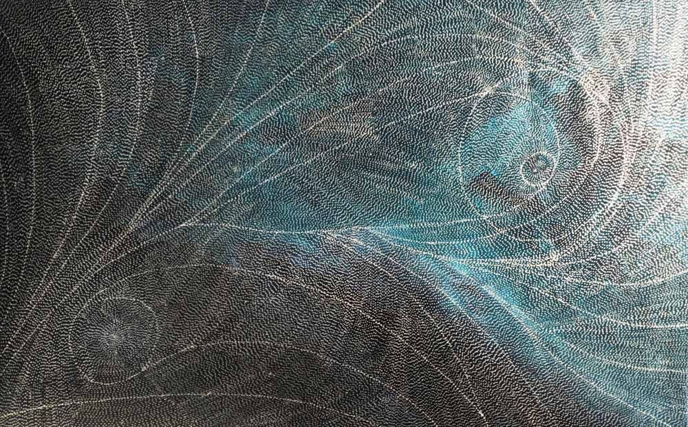 ‘Earth Elements’ is Sarrita’s latest series of artworks. Sarrita has been working on these ideas for years through her other series of works such as lightning and the elements artworks such as water. However Sarrita always wanted to make even more subtle artworks combining the many aspects of the earth elements and the repetitive patterns of these elements. In this particular piece Sarrita reflects on the beautiful fresh water pools that occur after the first big rainfalls or vast ocean waters. The colours are always different from one pool of water to another. But i am always amazed at the other markings that occur from the life on, in and around the water catchments. The fine dotting is an abstract representation of all this life. The subtleness and lightness of these dots represents the idea that these markings are made in the past, present and future, repetitive patterns for eternity.