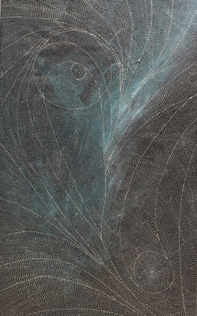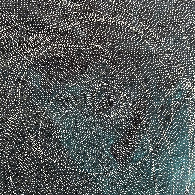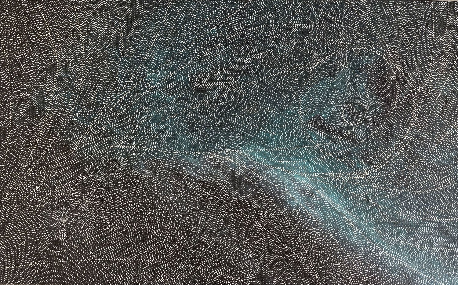 ‘Earth Elements’ is Sarrita’s latest series of artworks. Sarrita has been working on these ideas for years through her other series of works such as lightning and the elements artworks such as water. However Sarrita always wanted to make even more subtle artworks combining the many aspects of the earth elements and the repetitive patterns of these elements. In this particular piece Sarrita reflects on the beautiful fresh water pools that occur after the first big rainfalls or vast ocean waters. The colours are always different from one pool of water to another. But i am always amazed at the other markings that occur from the life on, in and around the water catchments. The fine dotting is an abstract representation of all this life. The subtleness and lightness of these dots represents the idea that these markings are made in the past, present and future, repetitive patterns for eternity.