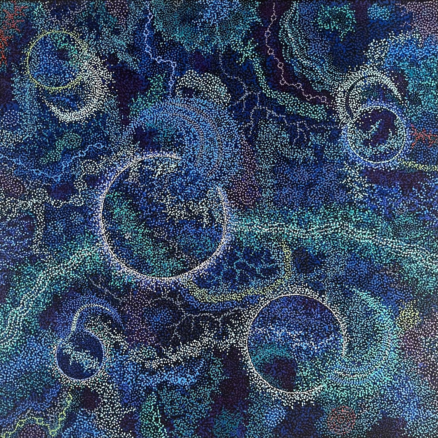 Common to Aboriginal practice, Tarisse was handed down the Earth Images style to paint by her father, William King Jangala. It is a macro view of land around the small remote town of Katherine, the area where her Gurindji tribe once inhabited. It details meandering rivers, small tributaries, active and abandoned campsites. The impact of strong colour is immediate in these artworks and the canvas is starkly broken by the dominant and contrasting lines mapping waterways cutting their way through the land. By concentrating her background dots or placing them sparingly Tarisse manages to create a 3-D effect of landscape, as if one was seeing all the undulations from a bird’s eye view.