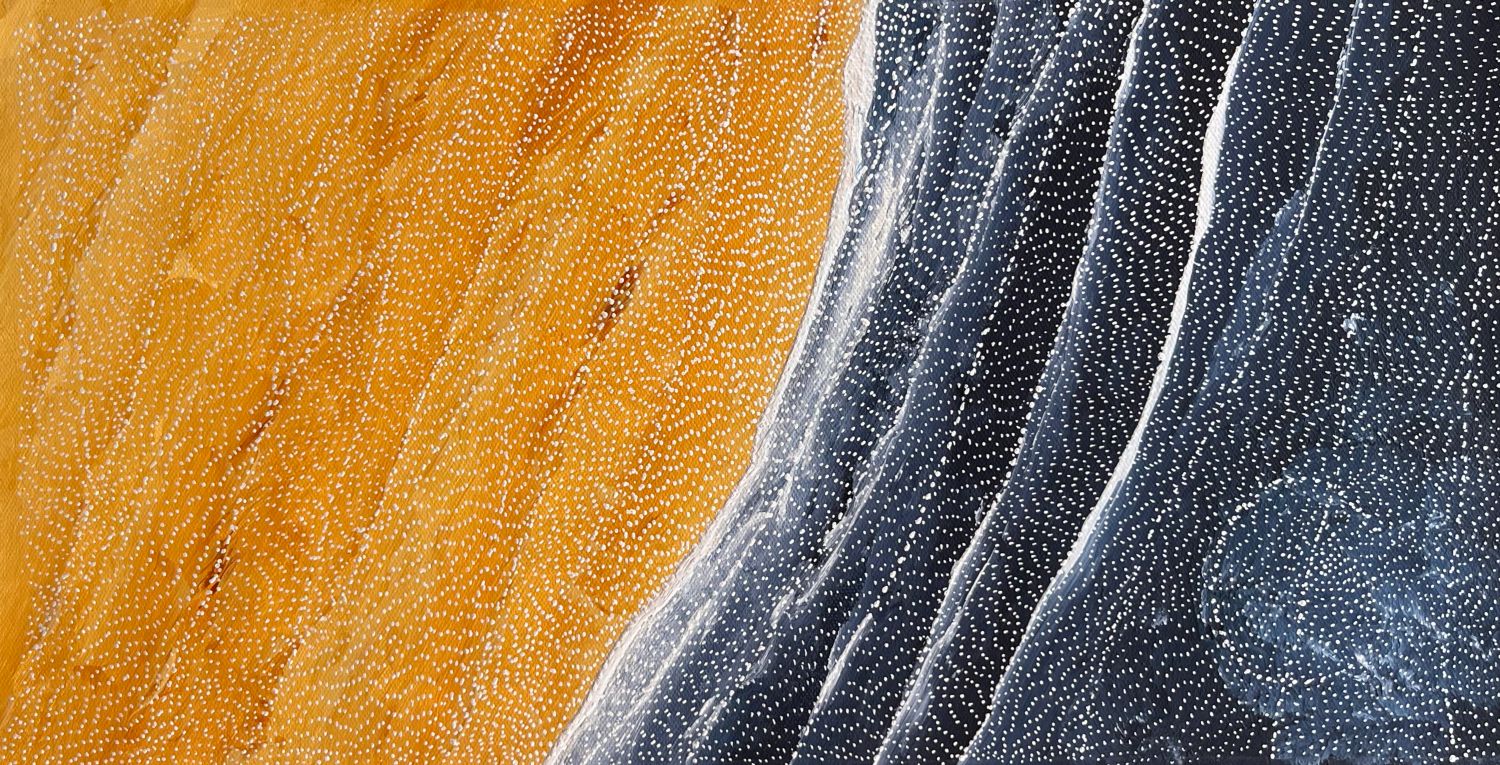 ‘Earth Elements’ is Sarrita’s latest series of artworks. Sarrita has been working on these ideas for years through her other series of works such as lightning and the elements artworks such as water. However Sarrita always wanted to make even more subtle artworks combining the many aspects of the earth elements and the repetitive patterns of these elements. In this particular piece Sarrita reflects on the beautiful fresh water pools that occur after the first big rainfalls or vast ocean waters. The colours are always different from one pool of water to another. But i am always amazed at the other markings that occur from the life on, in and around the water catchments. The fine dotting is an abstract representation of all this life. The subtleness and lightness of these dots represents the idea that these markings are made in the past, present and future, repetitive patterns for eternity.
