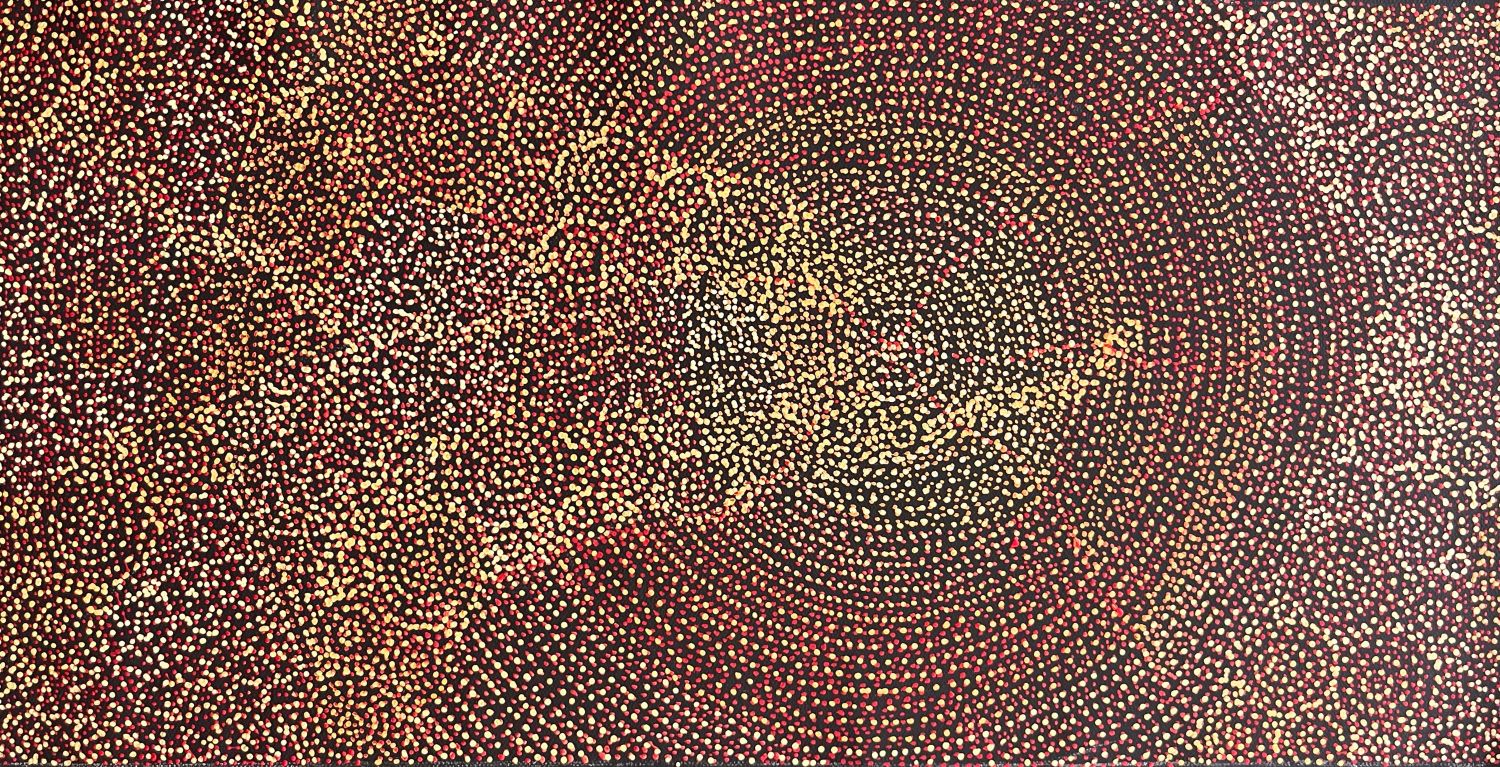 Sarrita’s “Ancestors” paintings, are layered with dots. Markings made on the land over thousands of years can be seen entangled with patterns covering the land today, such as sand hills, flora and paths made by humans and animals. Beneath the land are the waterways which have been virtually constant over time feeding the land, the flora, fauna and humans. These are the same waterways that supplied our ancestors which are now one with the land.