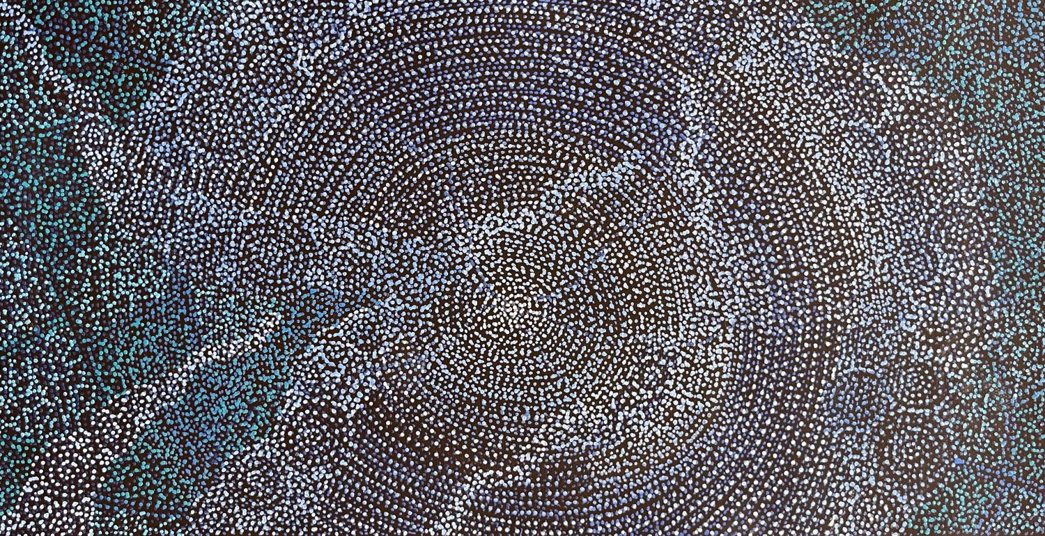 Sarrita’s “Ancestors” paintings, are layered with dots. Markings made on the land over thousands of years can be seen entangled with patterns covering the land today, such as sand hills, flora and paths made by humans and animals. Beneath the land are the waterways which have been virtually constant over time feeding the land, the flora, fauna and humans. These are the same waterways that supplied our ancestors which are now one with the land.