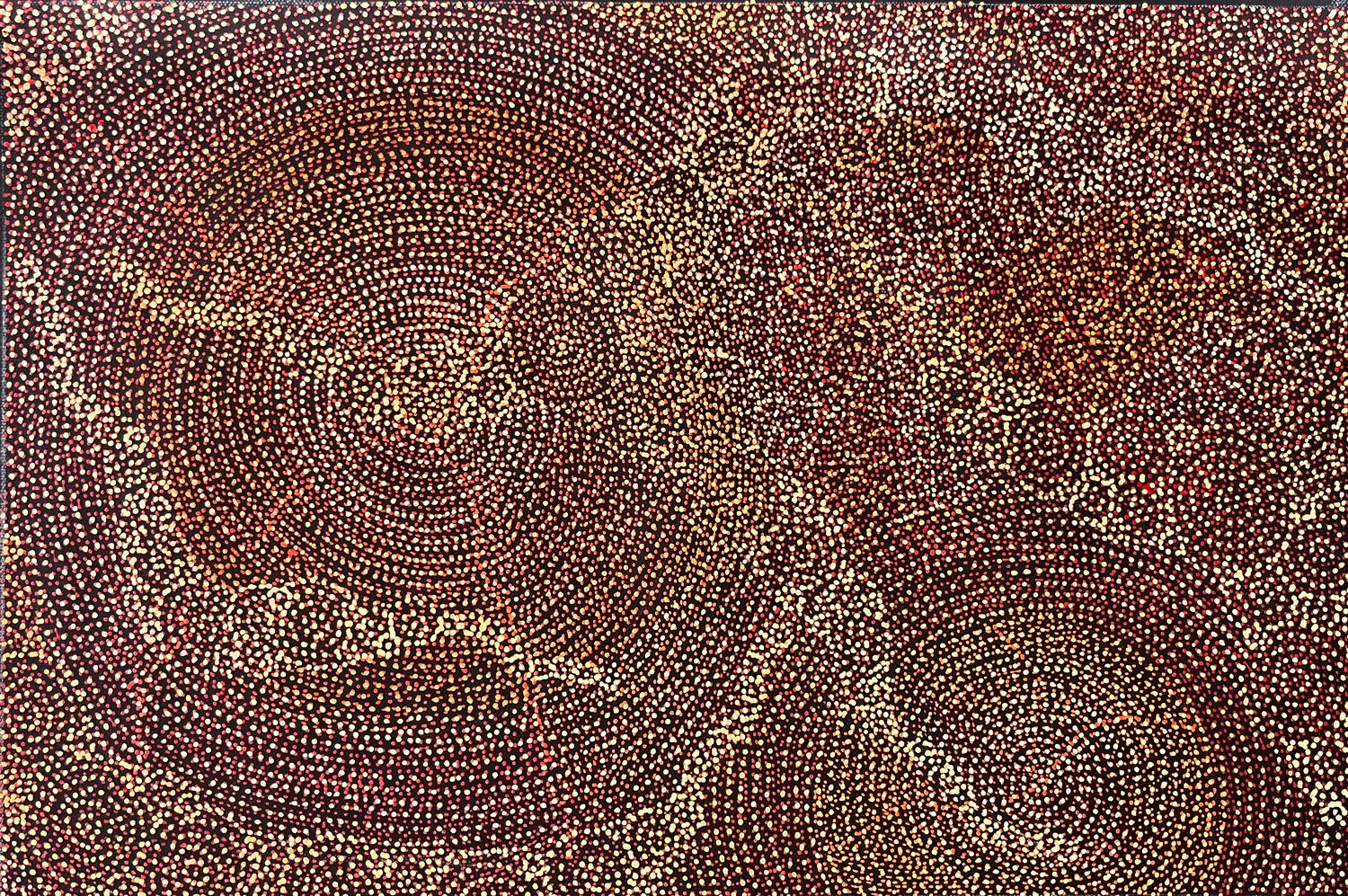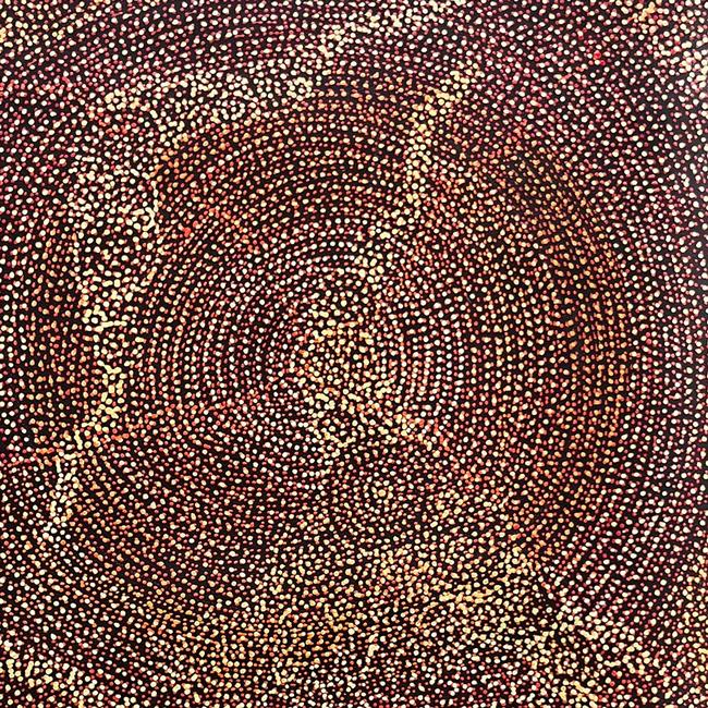 Sarrita’s “Ancestors” paintings, are layered with dots. Markings made on the land over thousands of years can be seen entangled with patterns covering the land today, such as sand hills, flora and paths made by humans and animals. Beneath the land are the waterways which have been virtually constant over time feeding the land, the flora, fauna and humans. These are the same waterways that supplied our ancestors which are now one with the land.