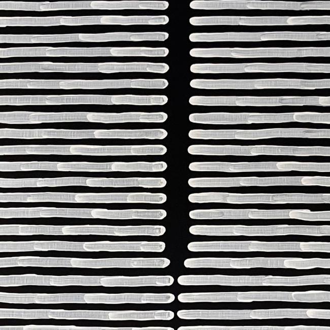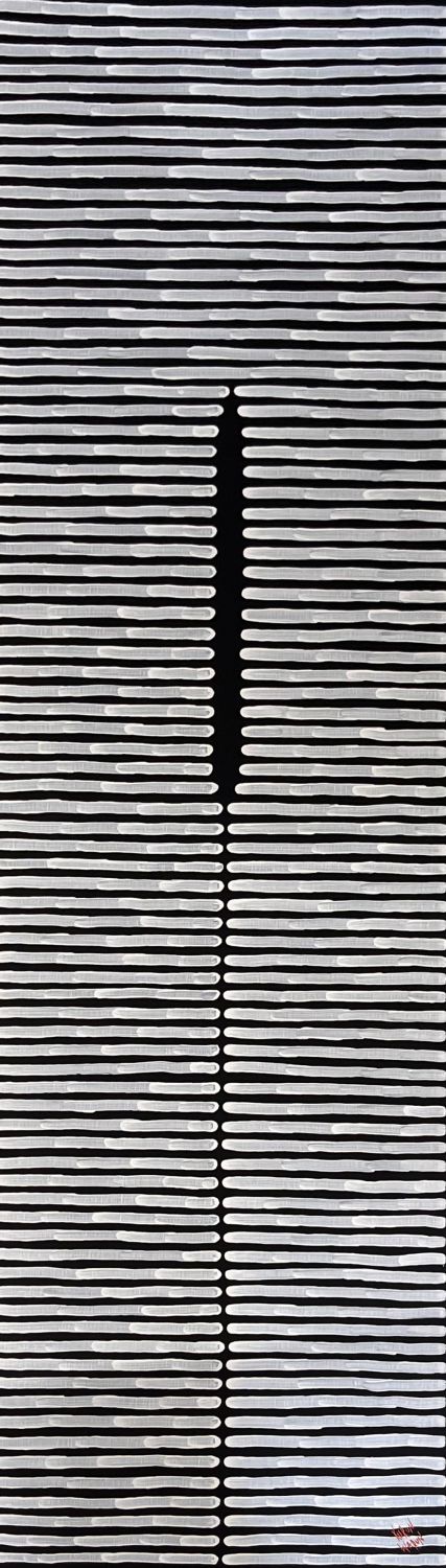 Kurun’s works represent the development of contemporary Aboriginal abstract art. While his paintings are often not clear at first glance, the stories they portray being to reveal themselves through colour, line and space. This painting presents a collection of fire sticks. Kurun Warun has depicted these as a reflection of himself and his family.