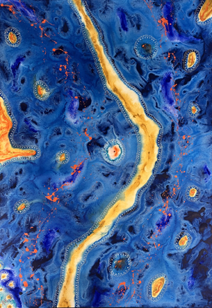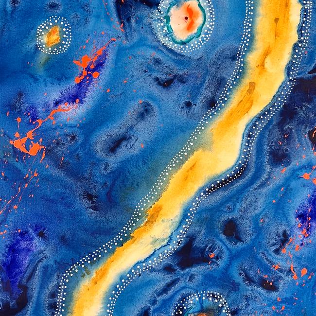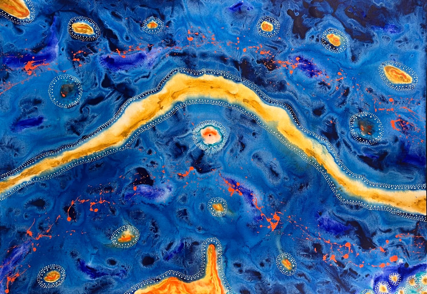 The curved yellow strip through the centre of the canvas represents a sand bar. The yellow shape on the edge of the canvas depicts the main headland. The vivid orange splashes represent various marine life alongside fish traps and mud crabs. This painting represents the ideal relationship between man and water, demonstrating how when man cares for water life, the water life reciprocates.