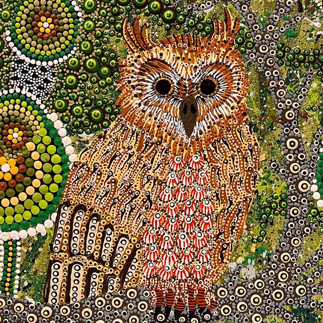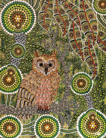 "This is just one of the names for this Owl from one of our many languages. The Owl I have painted is the Masked Owl. Their faces are heart shaped. They nest in our Eucalyptus trees in hollows in the tree. I have put the leaves of this tree in the painting".