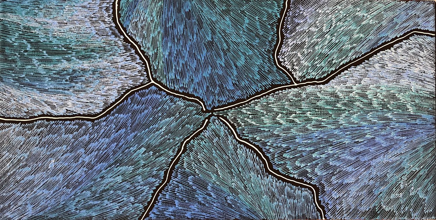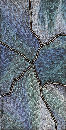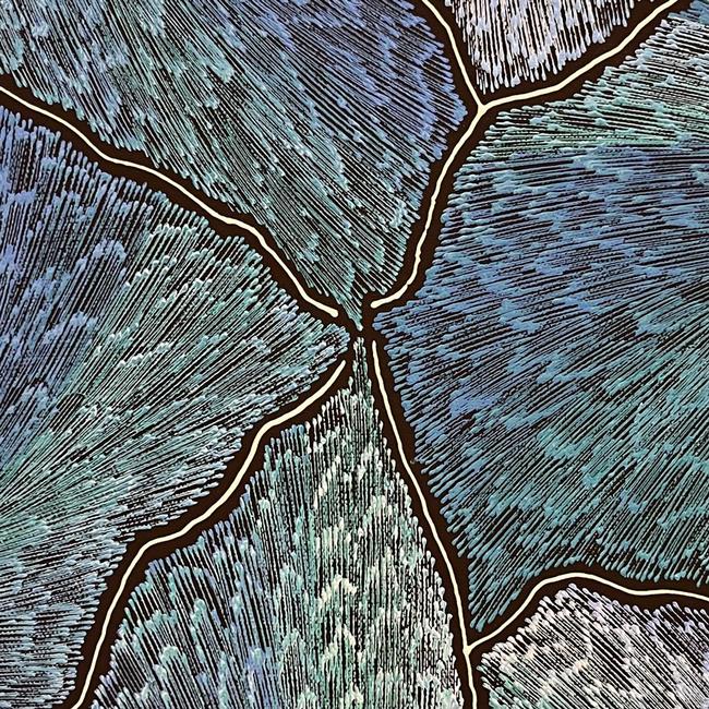 Sarrita’s Lightning paintings are a painted memory of the electrical storms in the tropical climate of Darwin where Sarrita spent her youth. The lightning would crack across the entire sky, creating lines not dissimilar to cracked earth. And with the lightning came the winds that in their fury whipped up all the dust, rain, heat and magnetic energy into a maelstrom in the air. Sarrita would discover new patterns and colours every time she witnessed these natural light shows.