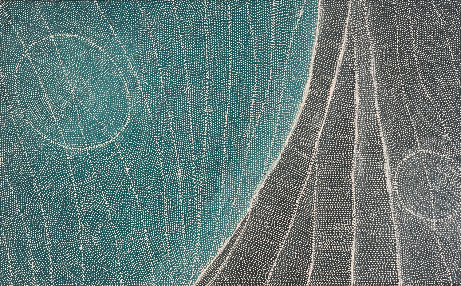 ‘Earth Elements’ is Sarrita’s latest series of artworks. Sarrita has been working on these ideas for years through her other series of works such as lightning and the elements artworks such as water. However Sarrita always wanted to make even more subtle artworks combining the many aspects of the earth elements and the repetitive patterns of these elements. In this particular piece Sarrita reflects on the beautiful fresh water pools that occur after the first big rainfalls or vast ocean waters. The colours are always different from one pool of water to another. But i am always amazed at the other markings that occur from the life on, in and around the water catchments. The fine dotting is an abstract representation of all this life. The subtleness and lightness of these dots represents the idea that these markings are made in the past, present and future, repetitive patterns for eternity.