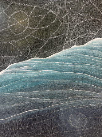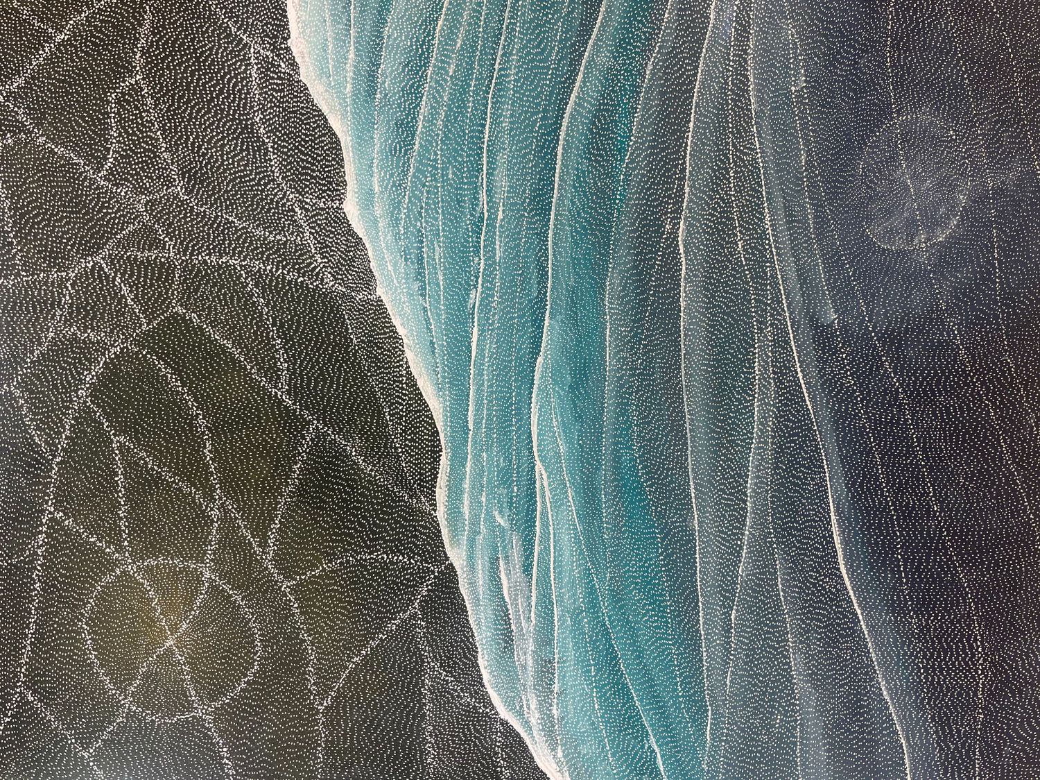 ‘Earth Elements’ is Sarrita’s latest series of artworks. Sarrita has been working on these ideas for years through her other series of works such as lightning and the elements artworks such as water. However Sarrita always wanted to make even more subtle artworks combining the many aspects of the earth elements and the repetitive patterns of these elements. In this particular piece Sarrita reflects on the beautiful fresh water pools that occur after the first big rainfalls or vast ocean waters. The colours are always different from one pool of water to another. But i am always amazed at the other markings that occur from the life on, in and around the water catchments. The fine dotting is an abstract representation of all this life. The subtleness and lightness of these dots represents the idea that these markings are made in the past, present and future, repetitive patterns for eternity.