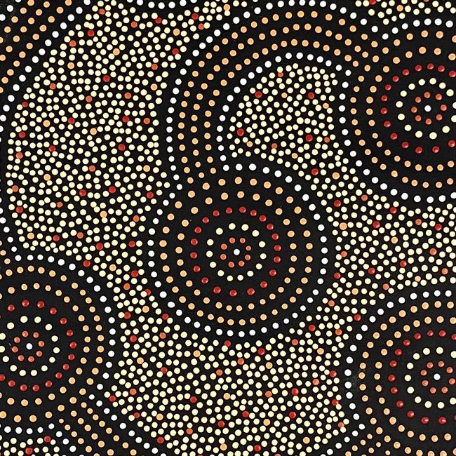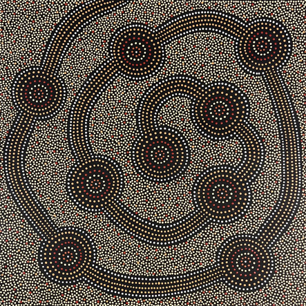 "This painting shows our country, the coastal and inland Aboriginal communities. The circles represent family groups and clans with tracks that show their connection to other Aboriginal groups within the nation."