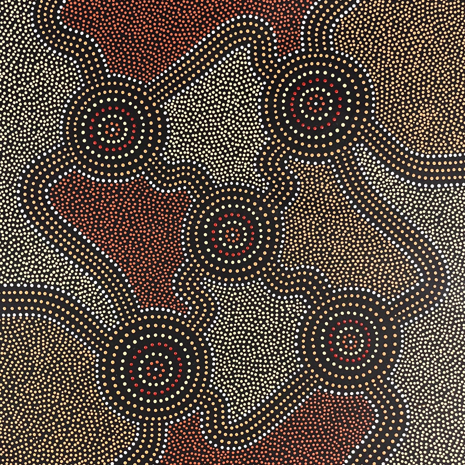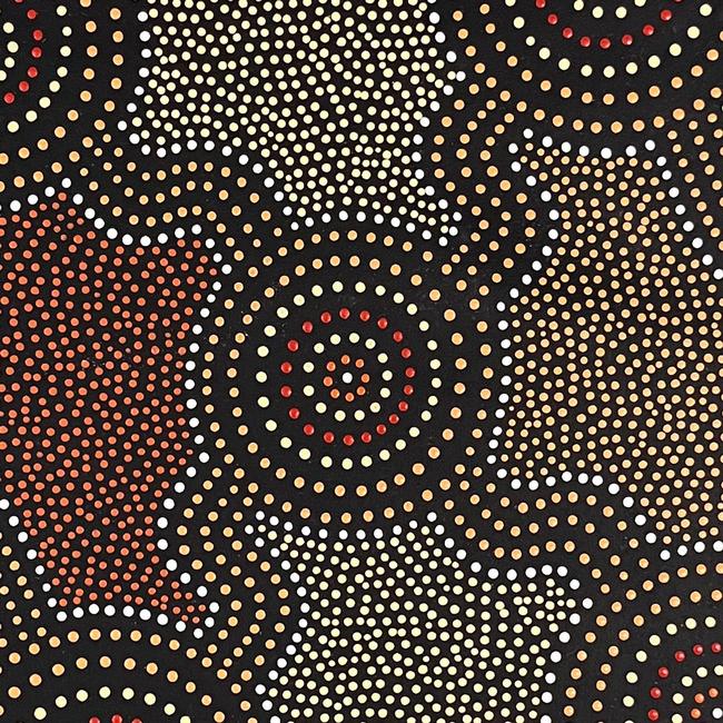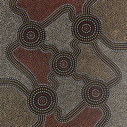 "This painting shows our country, the coastal and inland Aboriginal communities. The circles represent family groups and clans with tracks that show their connection to other Aboriginal groups within the nation."