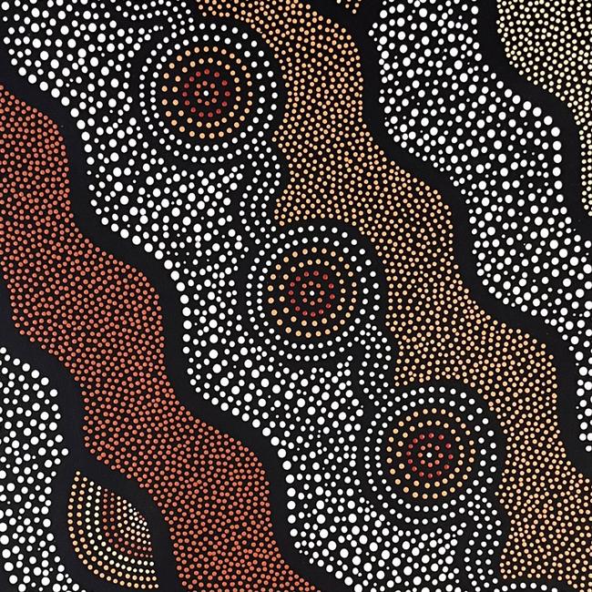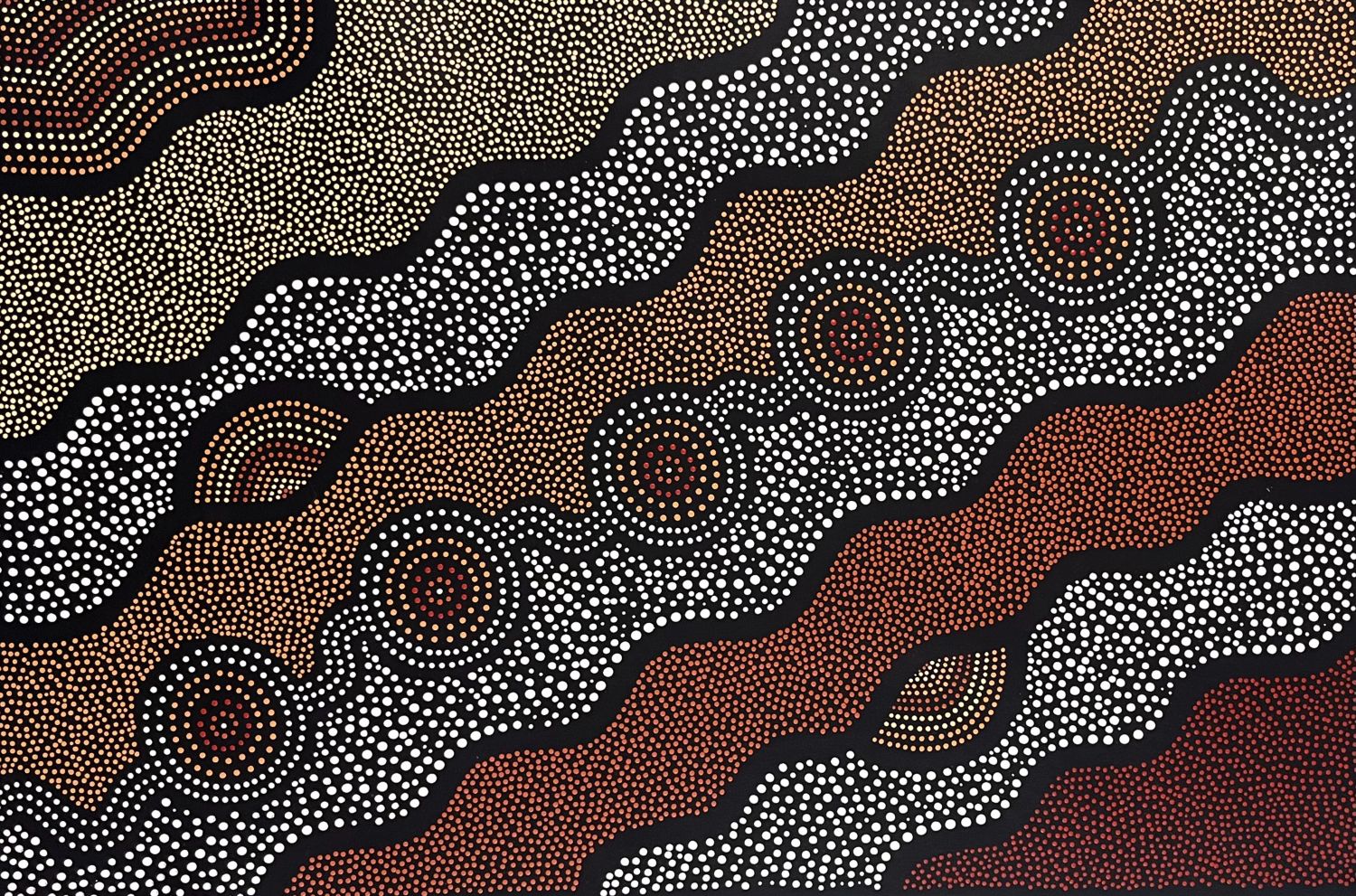 "This painting shows our country, the coastal and inland Aboriginal communities. The circles represent family groups and clans with tracks that show their connection to other Aboriginal groups within the nation."