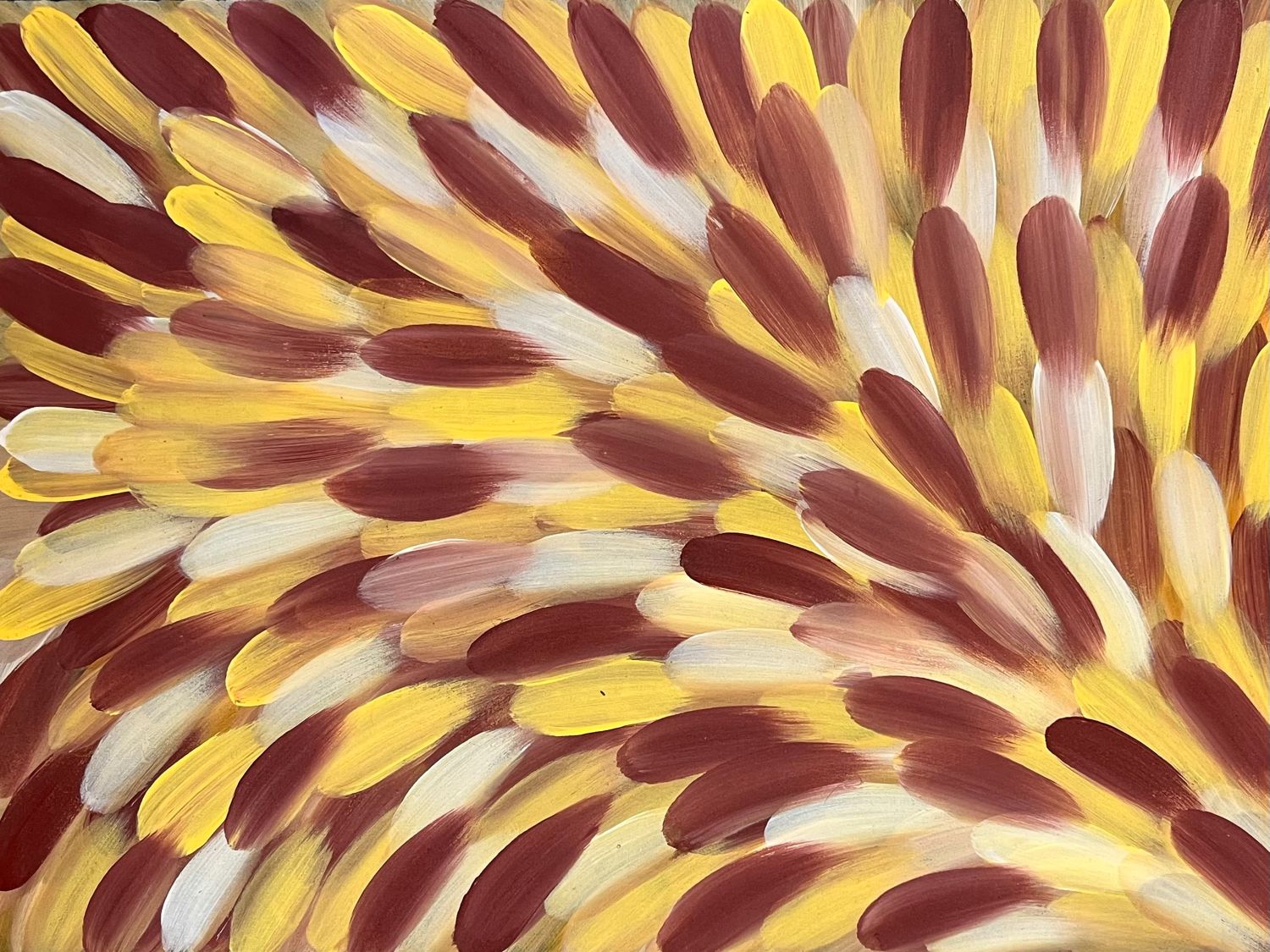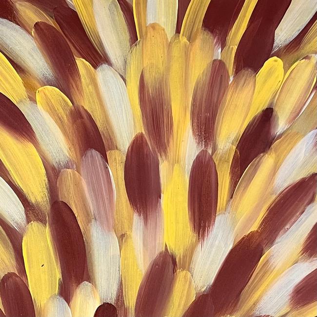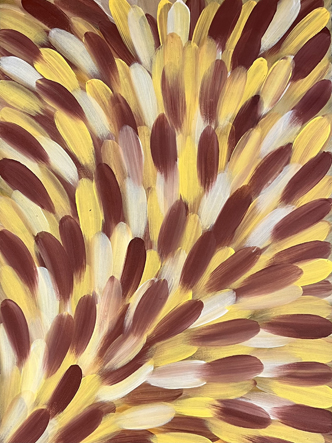 This work represents the leaves of the Kurrajong tree used in the Utopia region to treat a variety of ailments. The women collect the leaves, dry and mix them with Kangaroo fat, in order to extract the plant's medicinal qualities. The significance of the Kurrajong tree and the part it plays in healing is celebrated in the Women's Awelye ceremonies.