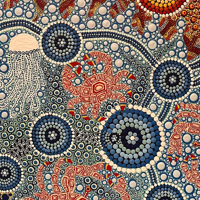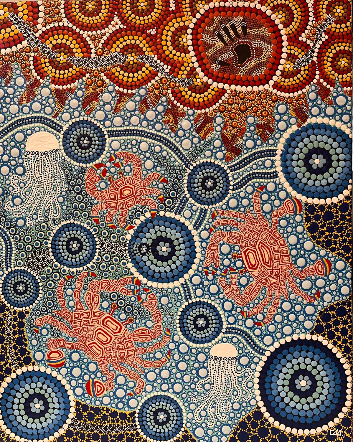 "The sand crabs are prized for food. The patterns of the water and jelly fish. The sand at the top flowing into the water. The hand says our people belong to this place".