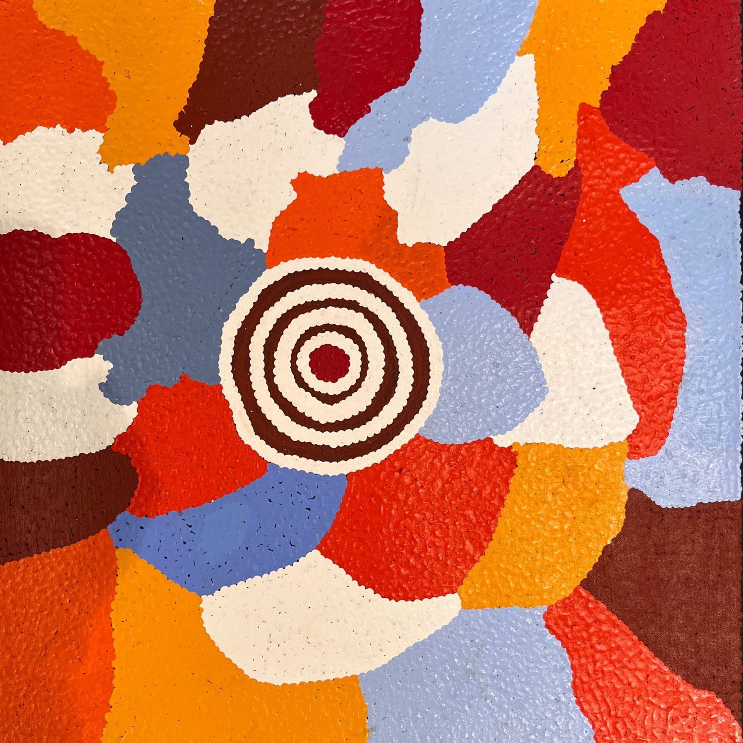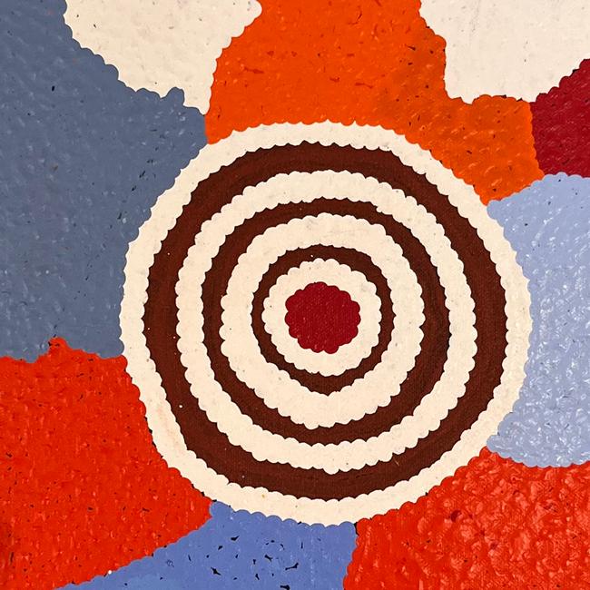 This artwork depicts an area in the desert where the woman go to have secret women's business. The songlines and body painting designs are handed down from one generation to another ensuring the story never gets lost.