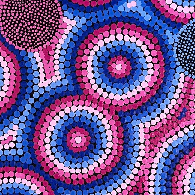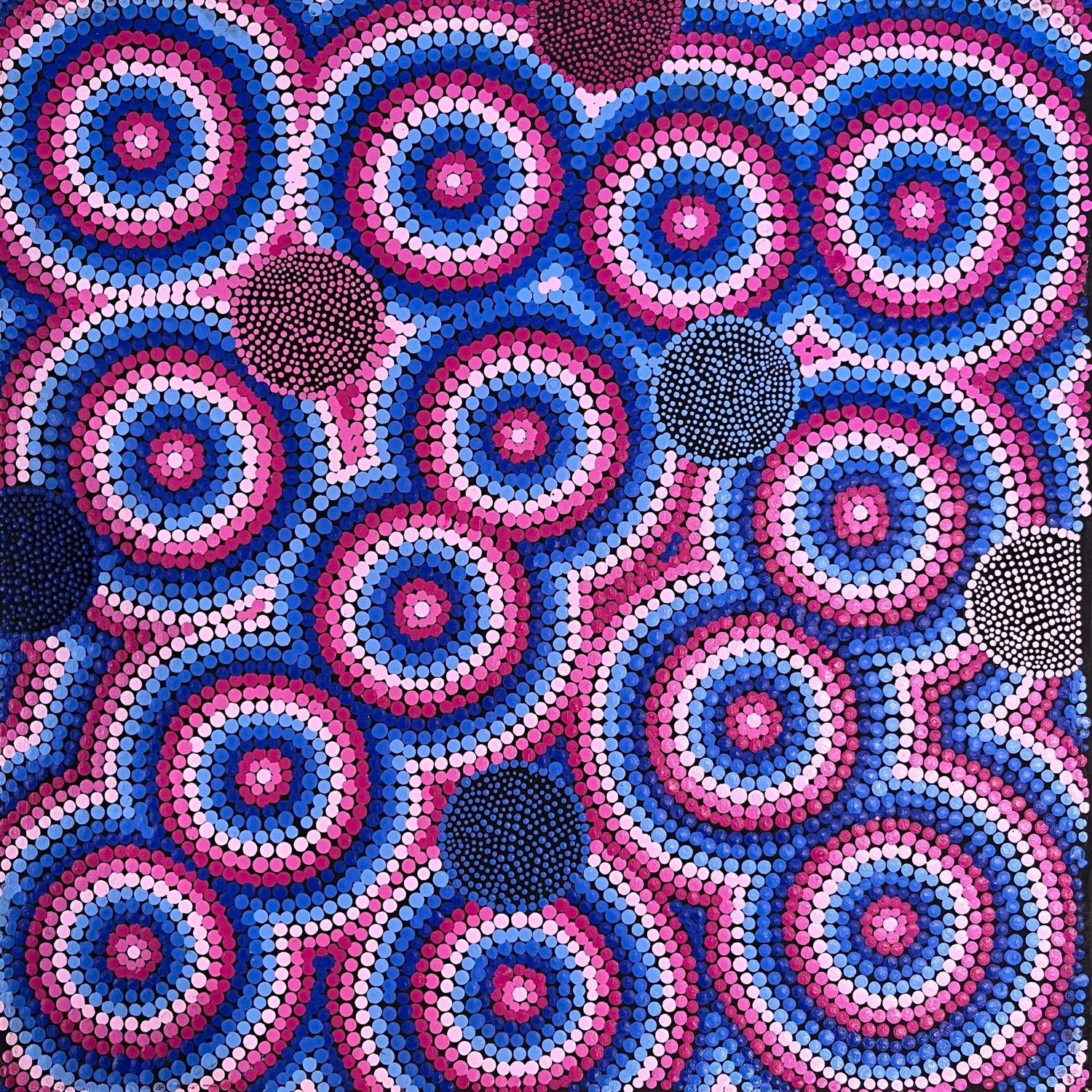 This artwork depicts the areas in which the women find the bush seeds to grind into a flour and make bush damper which is a bush bread.