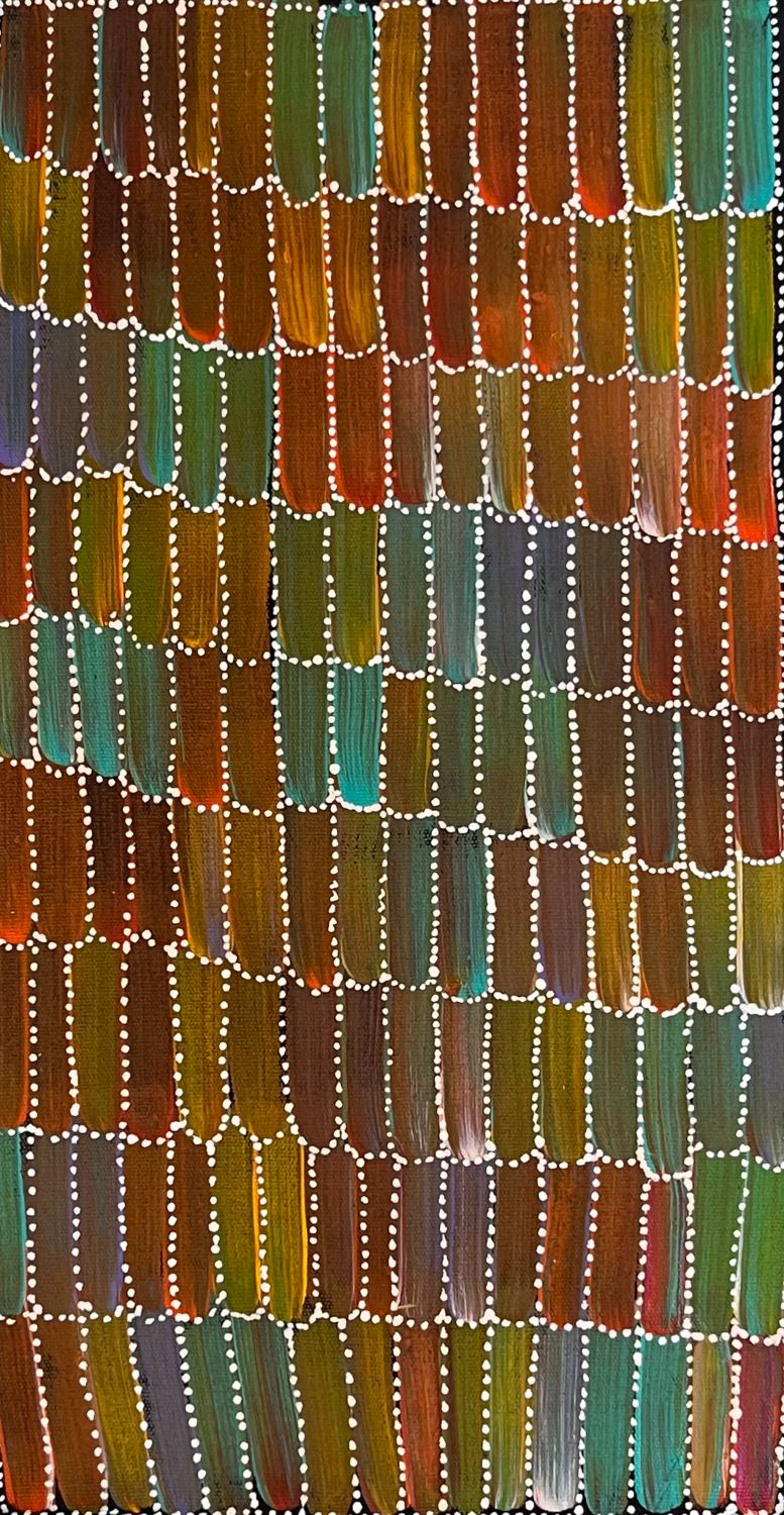 Jeannie paints the Anaty (Desert Yam or Bush Potato, Impomoea costata) story from her father's country, Irrwelty in Alyawarr land North East of Alice Springs. The yam grows underground with its viney shrub growing above ground up to 1 metre high. It is normally found on spinifex sand plains and produces large pink flowers after summer rain. The anaty is a tuber, or swollen root, of the shrub and tastes much like the common sweet potato. It can be eaten raw or cooked and is still a staple food for the desert Aborigines where it can be harvested at any time of the year. Some can be found as big as a person's head, making this a very important food source in the harsh Australian desert. In this painting Jeannie depicts the seed of the Anaty (dot work), and the Anaty flower (brush work and beautiful colours).