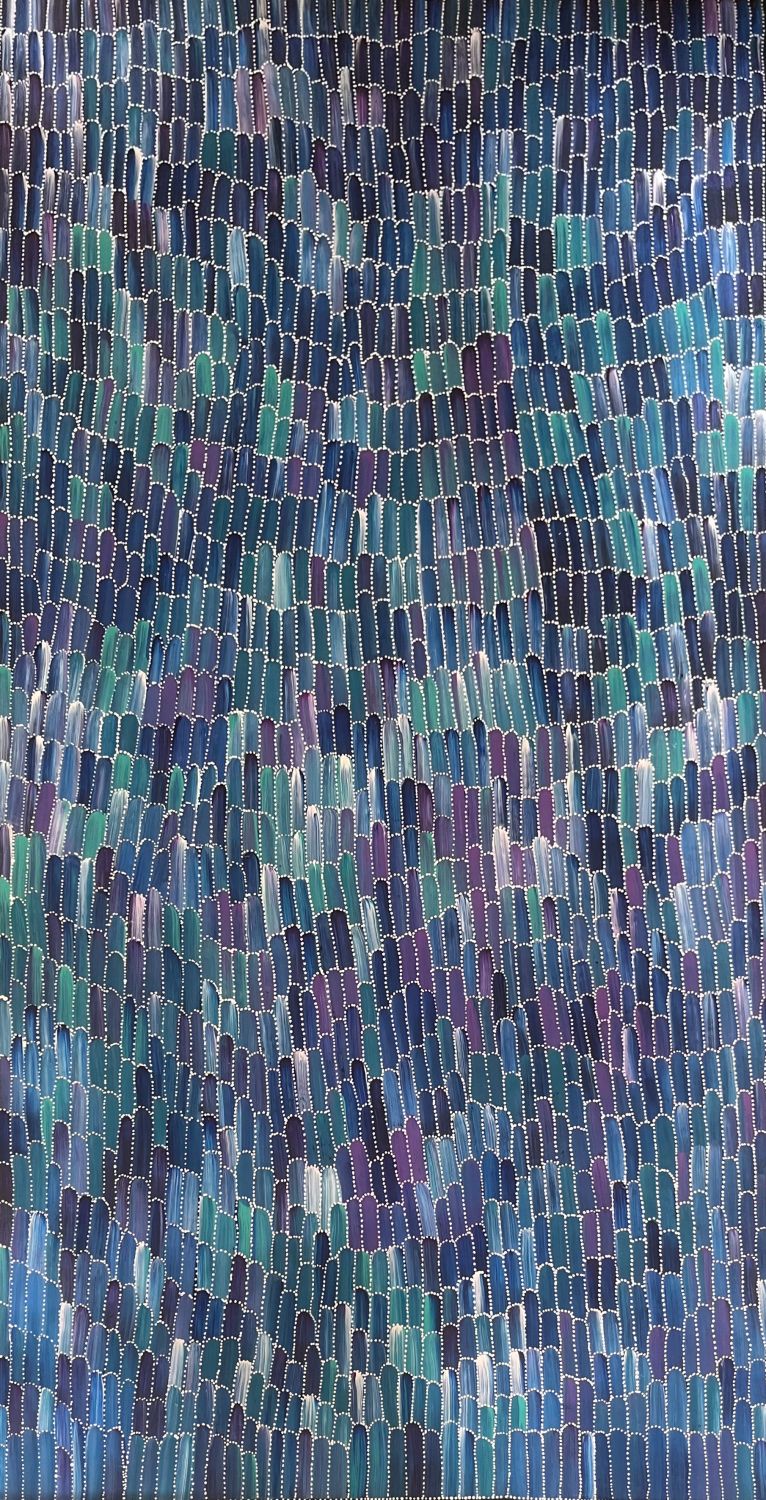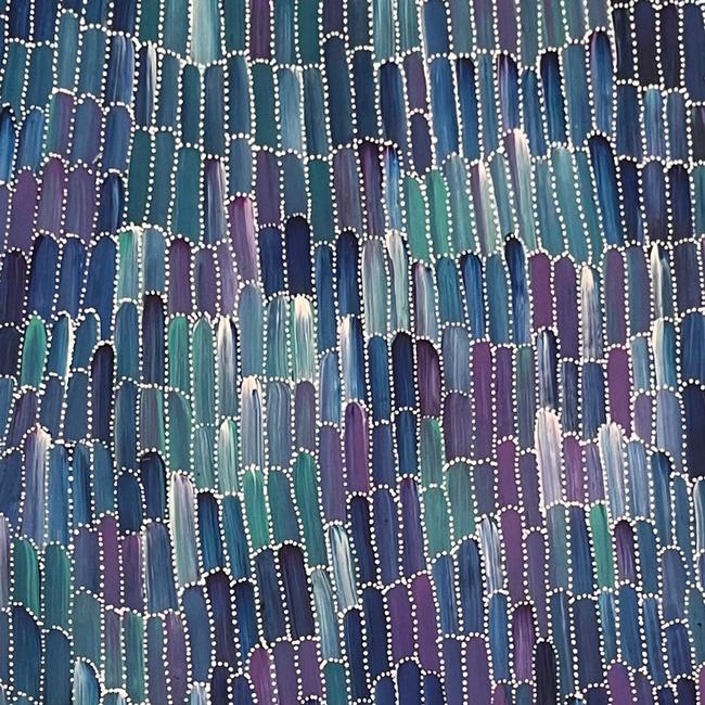Jeannie paints the Anaty (Desert Yam or Bush Potato, Impomoea costata) story from her father's country, Irrwelty in Alyawarr land North East of Alice Springs. The yam grows underground with its viney shrub growing above ground up to 1 metre high. It is normally found on spinifex sand plains and produces large pink flowers after summer rain. The anaty is a tuber, or swollen root, of the shrub and tastes much like the common sweet potato. It can be eaten raw or cooked and is still a staple food for the desert Aborigines where it can be harvested at any time of the year. Some can be found as big as a person's head, making this a very important food source in the harsh Australian desert. In this painting Jeannie depicts the seed of the Anaty (dot work), and the Anaty flower (brush work and beautiful colours).