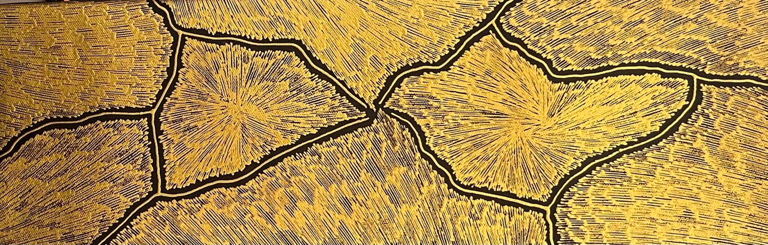 Sarrita’s Lightning paintings are a painted memory of the electrical storms in the tropical climate of Darwin where Sarrita spent her youth. The lightning would crack across the entire sky, creating lines not dissimilar to cracked earth. And with the lightning came the winds that in their fury whipped up all the dust, rain, heat and magnetic energy into a maelstrom in the air. Sarrita would discover new patterns and colours every time she witnessed these natural light shows.
