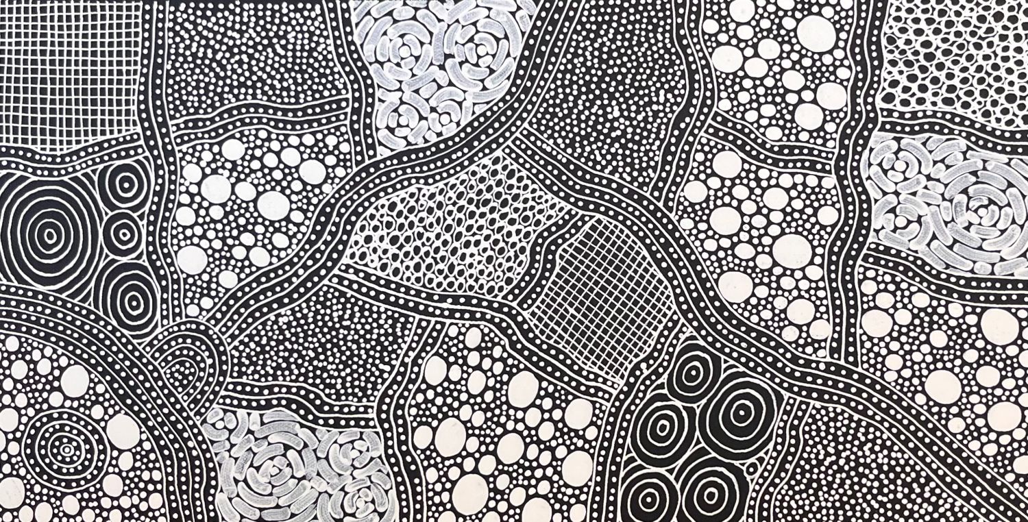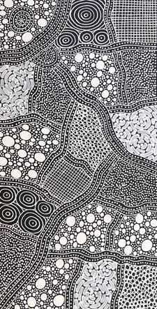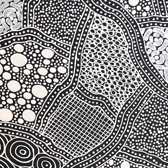 My Country – Tracks and Rivers Driven to map the country around Katherine, where her ancestors once walked, Tarisse depicts land formations such as rivers, rock holes, billabongs, shelters, tracks and food sources. In this series, Tarisse visually explores the way her ancestors interacted and lived with the environment.