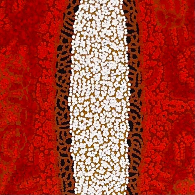 Features several waterfalls, in the centre is the junction of the 2 rivers meeting. The force of the water flowing from the waterfalls, penetrate the rocks surrounding the river. The different shades of reds represent the various shades of earth and people, young and old, approaching the river to catch the eels that congregated under the waterfalls.