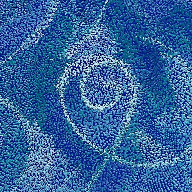 This artwork reflects the movement of the earth - a story originally from my father, the late William King Jungala. Inspired by the harsh elements of my grandmother’s country, Kalkaringi. The layering of the piece is reflective of those who survived while fostering the next generation. Hidden by time yet playing a pivotal role in shaping today’s paths. The movement across the canvas bends and flows, balancing todays fast paced life with cultural ties always calling us home, and ensuring we carry our stories and traditions forward long after we too are welcomed back to the land.