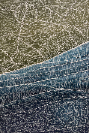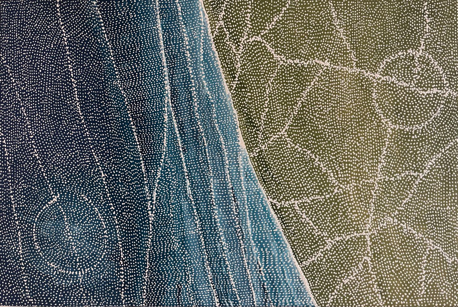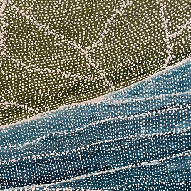‘Earth Elements’ is Sarrita’s latest series of artworks. Sarrita has been working on these ideas for years through her other series of works such as lightning and the elements artworks such as water. However Sarrita always wanted to make even more subtle artworks combining the many aspects of the earth elements and the repetitive patterns of these elements. In this particular piece Sarrita reflects on the beautiful fresh water pools that occur after the first big rainfalls or vast ocean waters. The colours are always different from one pool of water to another. But i am always amazed at the other markings that occur from the life on, in and around the water catchments. The fine dotting is an abstract representation of all this life. The subtleness and lightness of these dots represents the idea that these markings are made in the past, present and future, repetitive patterns for eternity.