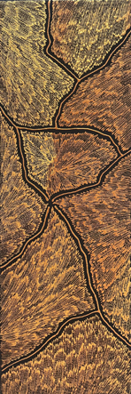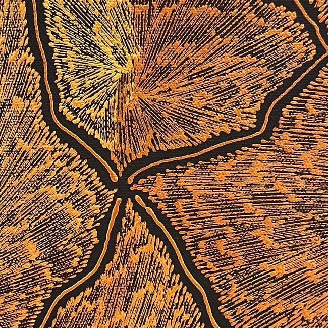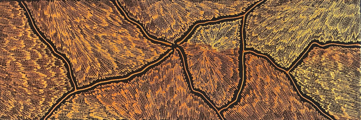 Sarrita’s Lightning paintings are a painted memory of the electrical storms in the tropical climate of Darwin where Sarrita spent her youth. The lightning would crack across the entire sky, creating lines not dissimilar to cracked earth. And with the lightning came the winds that in their fury whipped up all the dust, rain, heat and magnetic energy into a maelstrom in the air. Sarrita would discover new patterns and colours every time she witnessed these natural light shows.