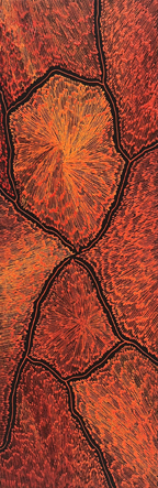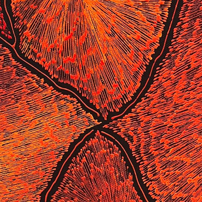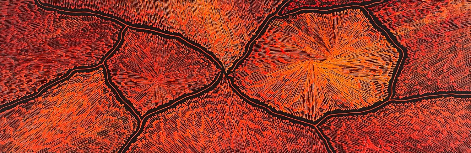 Sarrita’s Lightning paintings are a painted memory of the electrical storms in the tropical climate of Darwin where Sarrita spent her youth. The lightning would crack across the entire sky, creating lines not dissimilar to cracked earth. And with the lightning came the winds that in their fury whipped up all the dust, rain, heat and magnetic energy into a maelstrom in the air. Sarrita would discover new patterns and colours every time she witnessed these natural light shows.