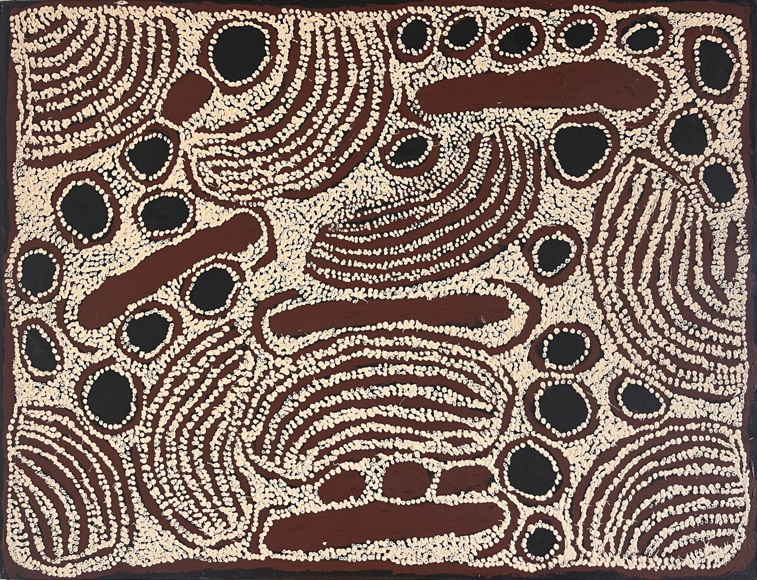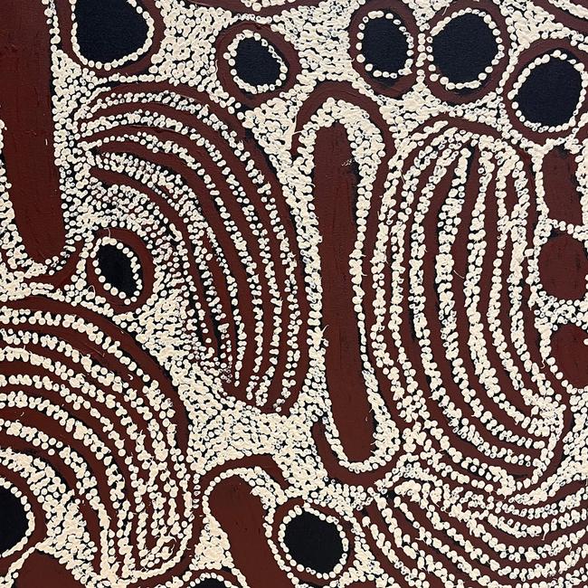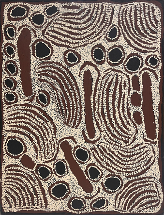 Ningura's works depict designs associated with Wirrulnga, a rocky site in Western Australia. Ancestral women were said to have camped at this site and collected bush food here. The site is associated with birth, as an ancestral woman gave birth there. It is also associated with hair string skirts that were made at the site and worn during ceremonies.